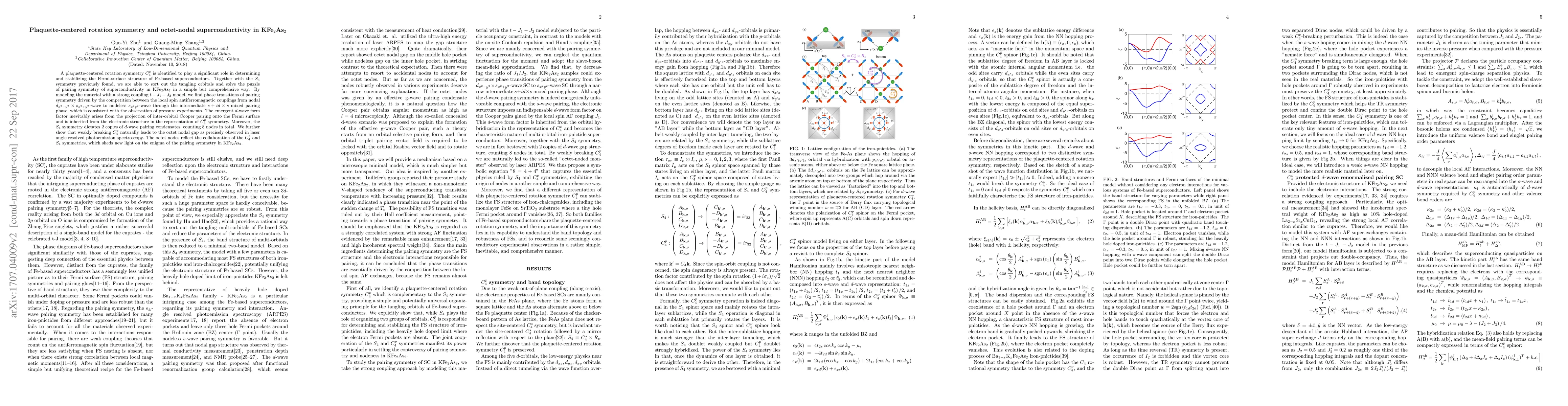 A plaquette-centered rotation symmetry $C_{4}^{p}$ is identified to play a significant role in determining and stabilizing the Fermi-surface structure of Fe-based superconductors. Together with the $S_{4}$ symmetry previously found, we are able to sort out the tangling orbitals and solve the puzzle of pairing symmetry of superconductivity in $\text{KFe}_{2}\text{As}_{2}$ in a simple but comprehensive way. By modeling the material with a strong coupling $t-J_{1}-J_{2}$ model, we find phase transitions of pairing symmetry driven by the competition between the local spin antiferromagnetic couplings from nodal $d_{x^2-y^2}\times s_{x^2+y^2}$-wave to nodeless $% s_{x^2 y^2} $-wave through the intermediate $s+id\times s$ mixed pairing phase, which is consistent with the observation of pressure experiments. The emergent $d$-wave form factor inevitably arises from the projection of inter-orbital Cooper pairing onto the Fermi surface and is inherited from the electronic structure in the representation of $C_{4}^{p}$ symmetry. Moreover, the $S_{4}$ symmetry dictates 2 copies of $d$-wave pairing condensates, counting 8 nodes in total. We further show that weakly breaking $C_{4}^{p}$ naturally leads to the octet nodal gap as precisely observed in laser angle resolved photoemission spectroscopy. The octet nodes reflect the collaboration of the $C_{4}^{p}$ and $S_{4}$ symmetries, which sheds new light on the enigma of the pairing symmetry in $\text{KFe}_{2}\text{As}_{2}$.