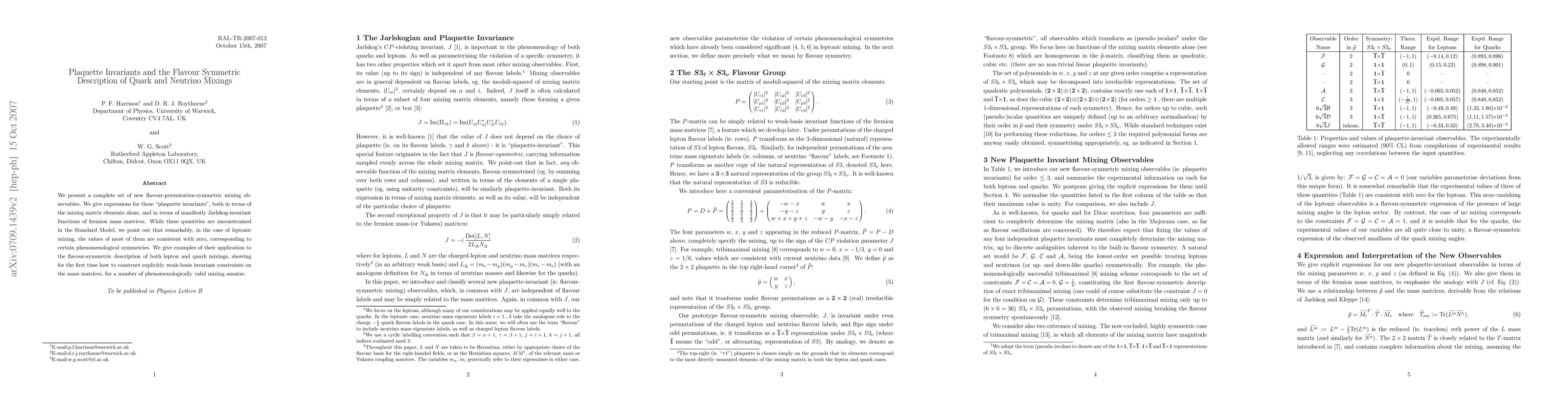 We present a complete set of new flavour-permutation-symmetric mixing observables. We give expressions for these "plaquette invariants", both in terms of the mixing matrix elements alone, and in terms of manifestly Jarlskog-invariant functions of fermion mass matrices. While these quantities are unconstrained in the Standard Model, we point out that remarkably, in the case of leptonic mixing, the values of most of them are consistent with zero, corresponding to certain phenomenological symmetries. We give examples of their application to the flavour-symmetric description of both lepton and quark mixings, showing for the first time how to construct explicitly weak-basis invariant constraints on the mass matrices, for a number of phenomenologically valid mixing ansatze.