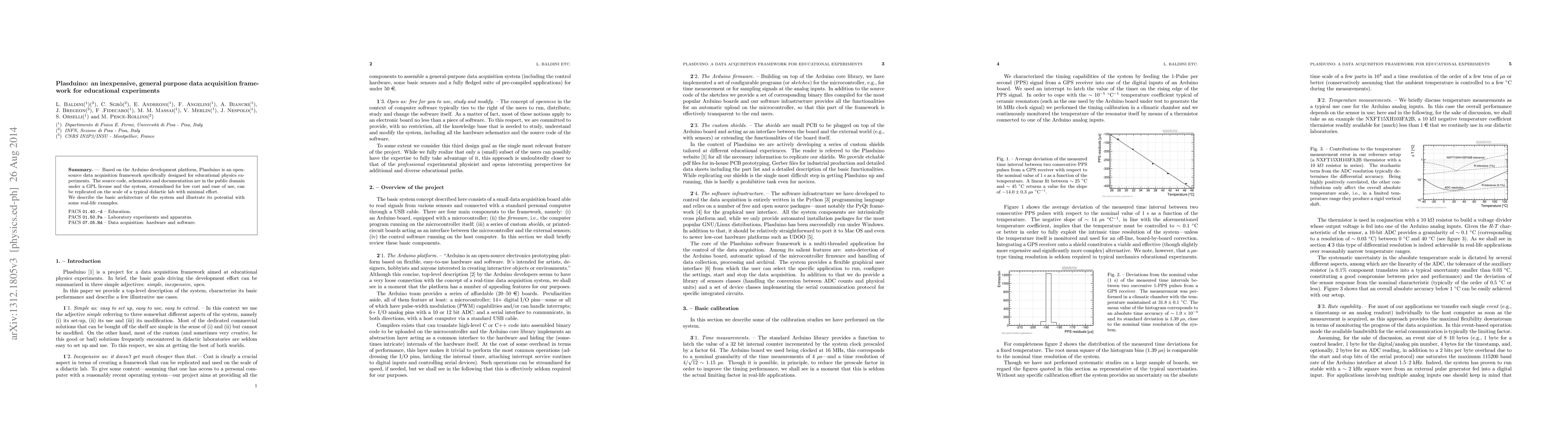 Plasduino is an open-source, low-cost data acquisition framework based on Arduino, designed for educational physics experiments. It offers easy replication and use in typical didactic labs, with its source code, schematics, and documentation freely available under a GPL license.