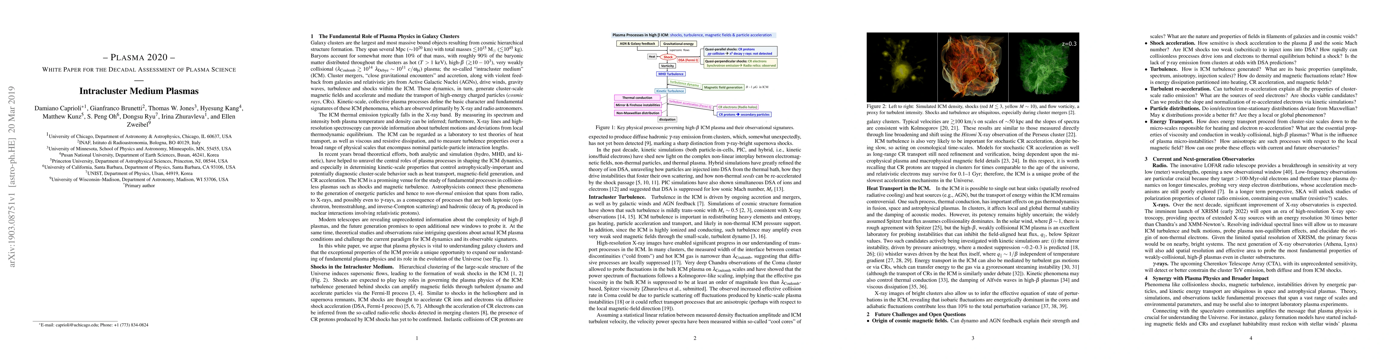 Galaxy clusters are the largest and most massive bound objects resulting from cosmic hierarchical structure formation. Baryons account for somewhat more than 10% of that mass, with roughly 90% of the baryonic matter distributed throughout the clusters as hot ($T>1$ keV), high-$\beta$, very weakly collisional plasma; the so-called "intracluster medium" (ICM). Cluster mergers, close gravitational encounters and accretion, along with violent feedback from galaxies and relativistic jets from active galactic nuclei, drive winds, gravity waves, turbulence and shocks within the ICM. Those dynamics, in turn, generate cluster-scale magnetic fields and accelerate and mediate the transport of high-energy charged particles. Kinetic-scale, collective plasma processes define the basic character and fundamental signatures of these ICM phenomena, which are observed primarily by X-ray and radio astronomers.