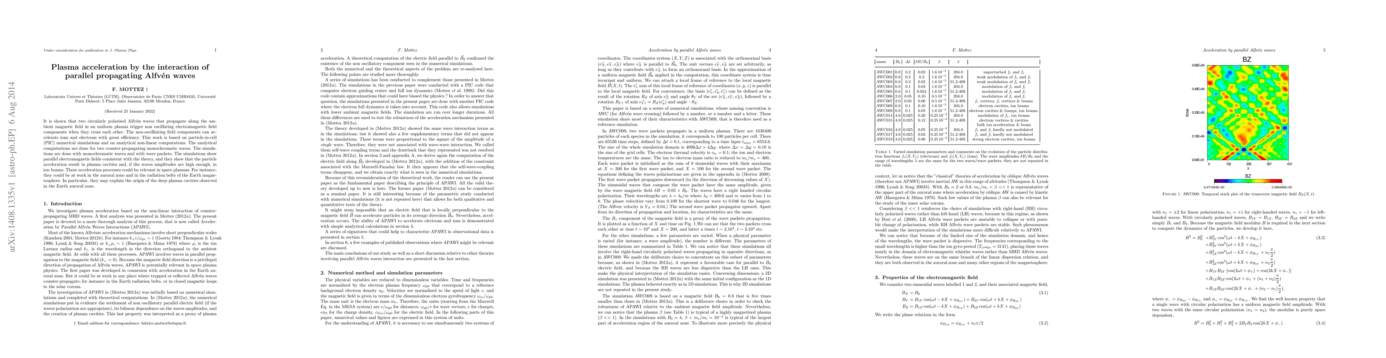 It is shown that two circularly polarised Alfv\'en waves that propagate along the ambient magnetic field in an uniform plasma trigger non oscillating electromagnetic field components when they cross each other. The non-oscilliating field components can accelerate ions and electrons with great efficiency. This work is based on particle-in-cell (PIC) numerical simulations and on analytical non-linear computations. The analytical computations are done for two counter-propagating monochromatic waves. The simulations are done with monochromatic waves and with wave packets. The simulations show parallel electromagnetic fields consistent with the theory, and they show that the particle acceleration result in plasma cavities and, if the waves amplitudes are high enough, in ion beams. These acceleration processes could be relevant in space plasmas. For instance, they could be at work in the auroral zone and in the radiation belts of the Earth magnetosphere. In particular, they may explain the origin of the deep plasma cavities observed in the Earth auroral zone.