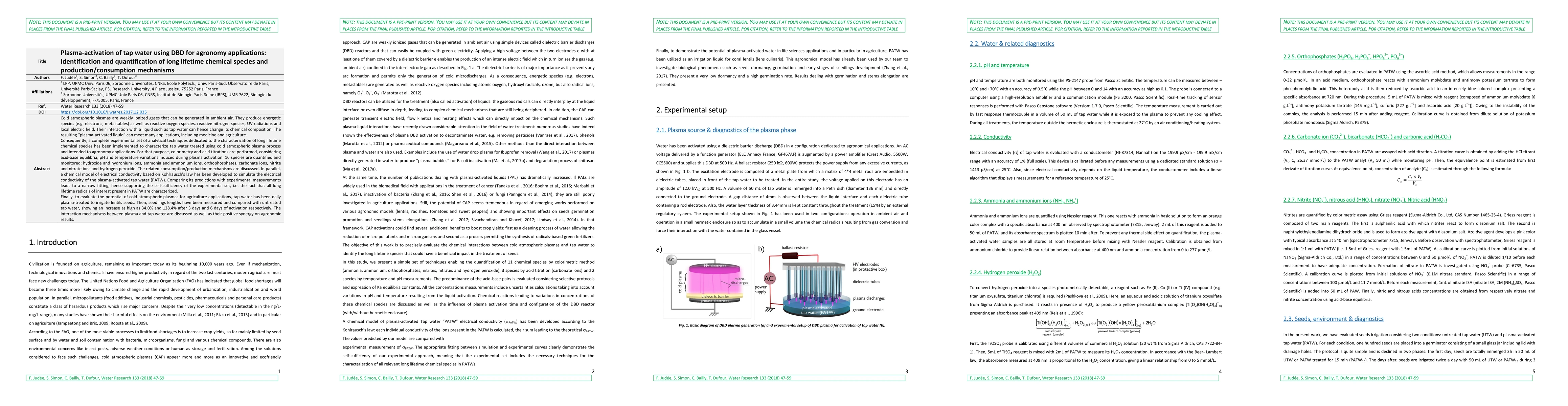 This paper investigates the chemical changes in tap water activated by cold atmospheric plasma (CAP) for agronomy applications. It identifies and quantifies 16 long-lifetime chemical species, including ions and hydrogen peroxide, and discusses their production/consumption mechanisms. Results show a significant increase in lentil seedling growth, suggesting potential agricultural benefits from plasma-activated water.