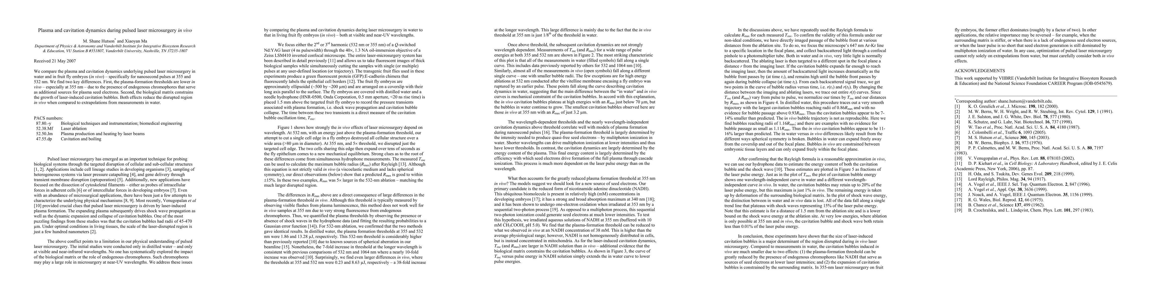 We compare the plasma and cavitation dynamics underlying pulsed laser microsurgery in water and in fruit fly embryos (in vivo) - specifically for nanosecond pulses at 355 and 532 nm. We find two key differences. First, the plasma-formation thresholds are lower in vivo - especially at 355 nm - due to the presence of endogenous chromophores that serve as additional sources for plasma seed electrons. Second, the biological matrix constrains the growth of laser-induced cavitation bubbles. Both effects reduce the disrupted region in vivo when compared to extrapolations from measurements in water.