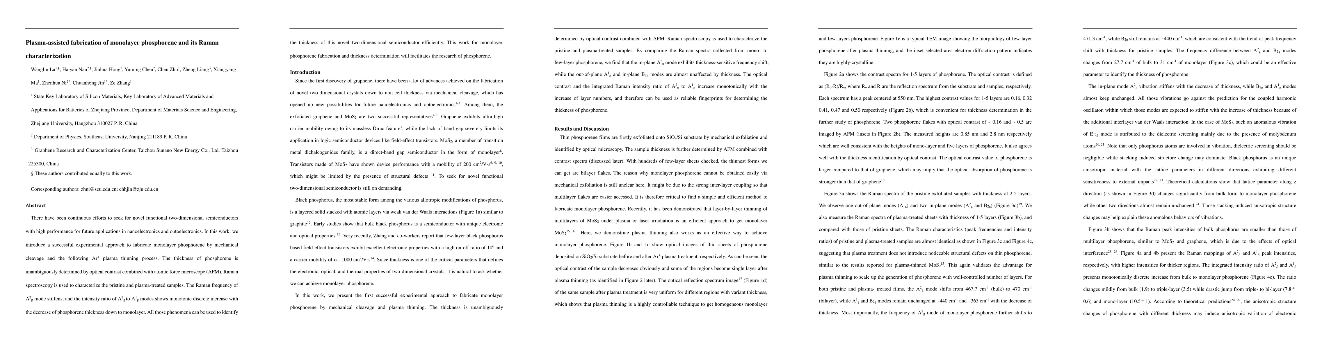 This paper presents a method for fabricating monolayer phosphorene using mechanical cleavage followed by Ar+ plasma thinning, verified by optical contrast and AFM. Raman spectroscopy reveals changes in the A2g mode frequency and A2g/A1g intensity ratio, aiding in the efficient identification of phosphorene thickness.
