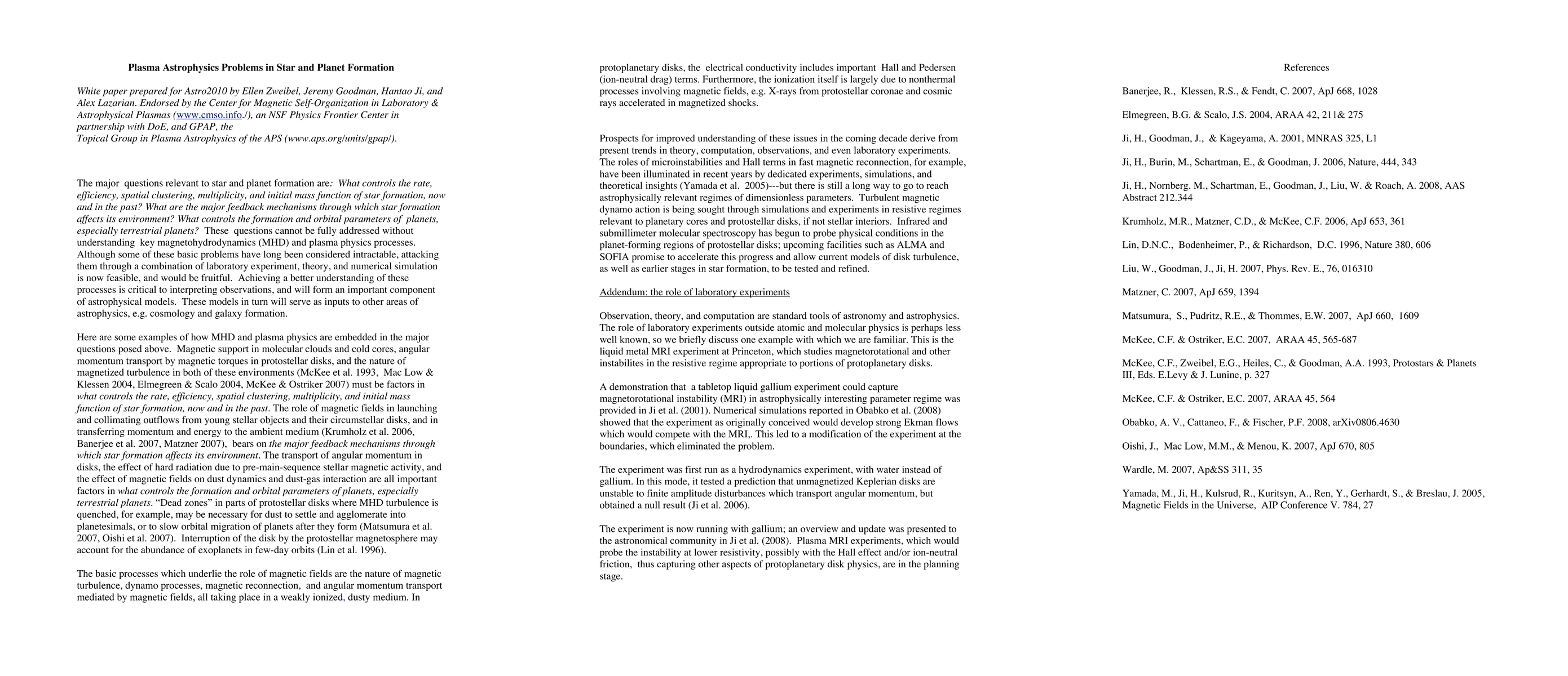 The major questions relevant to star and planet formation are: What controls the rate, efficiency, spatial clustering, multiplicity, and initial mass function of star formation, now and in the past? What are the major feedback mechanisms through which star formation affects its environment? What controls the formation and orbital parameters of planets, especially terrestrial planets? These questions cannot be fully addressed without understanding key magnetohydrodynamics (MHD) and plasma physics processes. Although some of these basic problems have long been considered intractable, attacking them through a combination of laboratory experiment, theory, and numerical simulation is now feasible, and would be fruitful. Achieving a better understanding of these processes is critical to interpreting observations, and will form an important component of astrophysical models. These models in turn will serve as inputs to other areas of astrophysics, e.g. cosmology and galaxy formation.