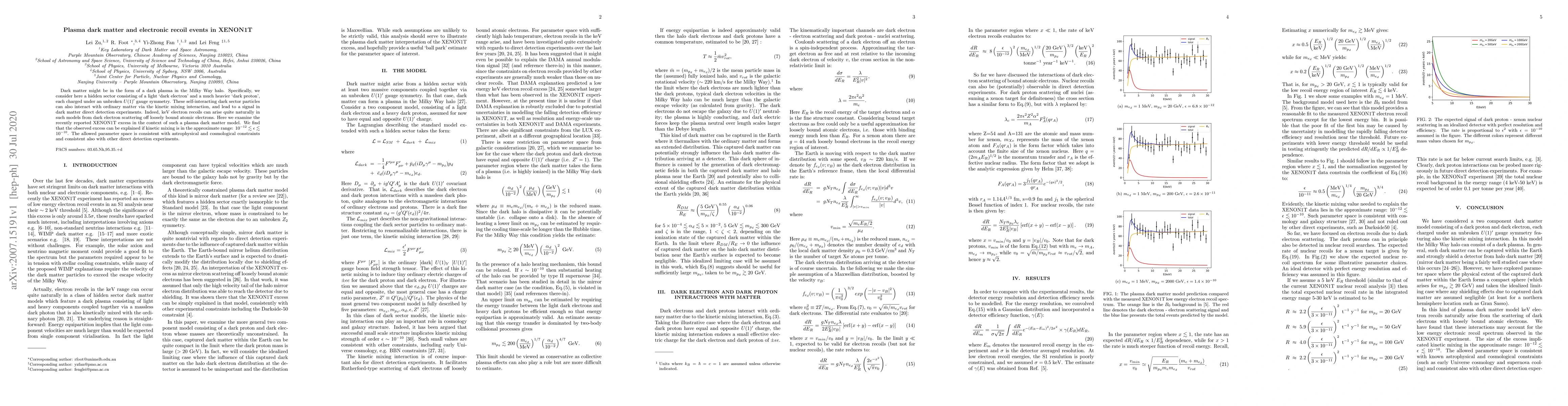 This paper explores a dark plasma model for dark matter, proposing a hidden sector with light and heavy charged particles. It suggests that the XENON1T excess can be explained by keV electron recoils from dark electron scattering, with kinetic mixing in the range $10^{-12} \lesssim \epsilon \lesssim 10^{-10}$. The model is consistent with astrophysical and cosmological constraints and other direct detection experiments.