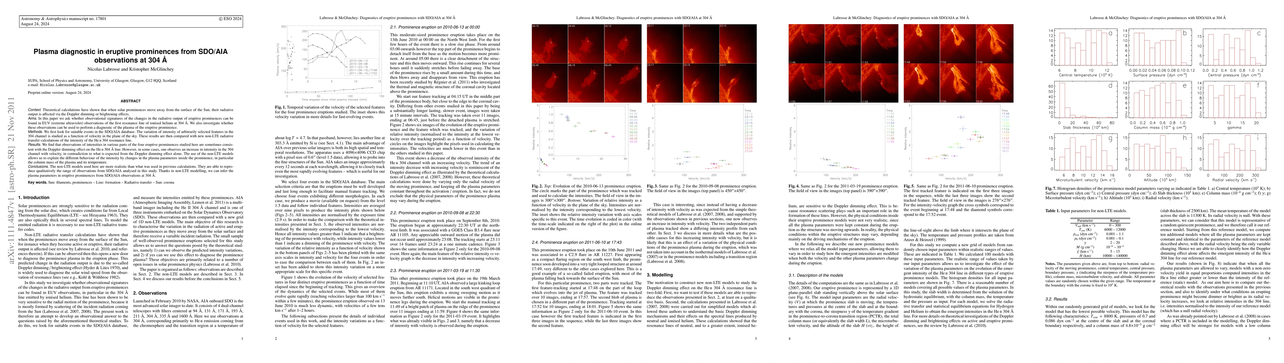 This paper investigates the radiative output changes in eruptive prominences using SDO/AIA 304 Å EUV observations, finding that Doppler effects and non-LTE models can explain variations in intensity, allowing for the diagnostic of plasma parameters within the prominences.