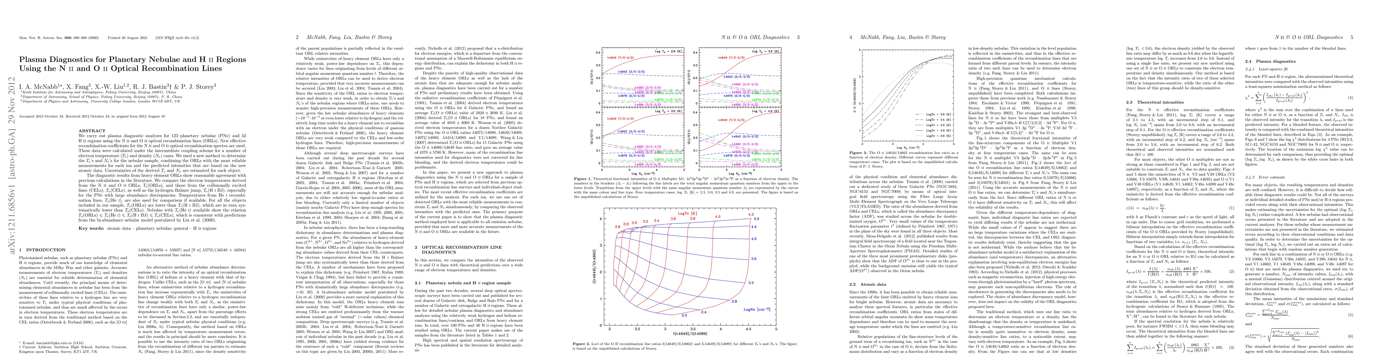 This paper presents plasma diagnostics for 123 planetary nebulae and 42 H II regions using N II and O II optical recombination lines, with new effective recombination coefficients. The study finds that electron temperatures derived from recombination lines are systematically lower than those from collisionally excited lines, supporting the bi-abundance nebular model.