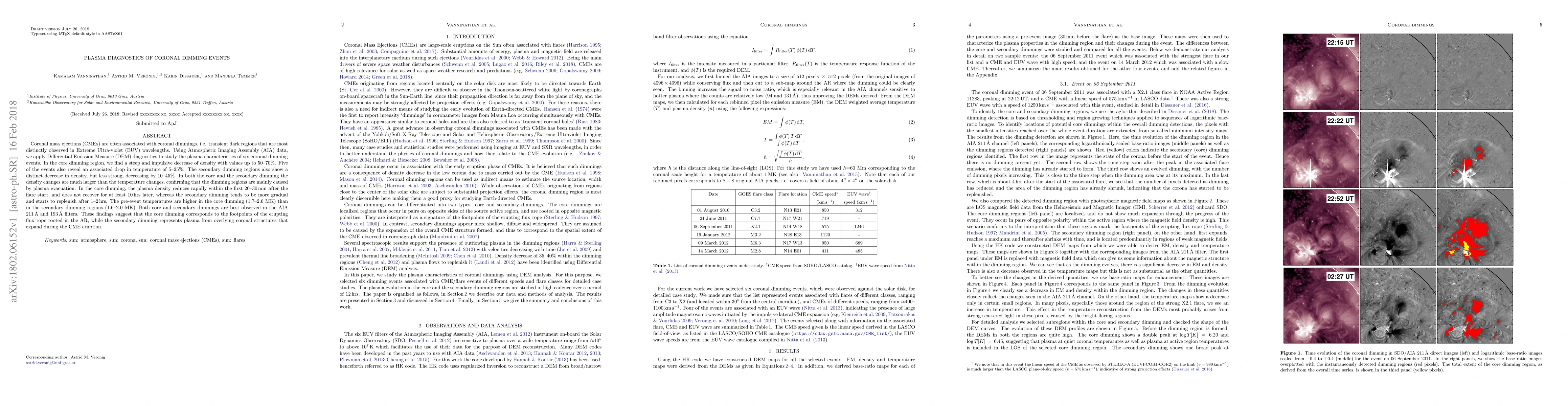 This study uses AIA data and DEM diagnostics to analyze the plasma characteristics of six coronal dimming events, finding significant density decreases (up to 70%) in core regions and smaller decreases in secondary regions, with minimal temperature changes. The core dimming shows rapid density reduction post-flare, while secondary dimming recovers more gradually.