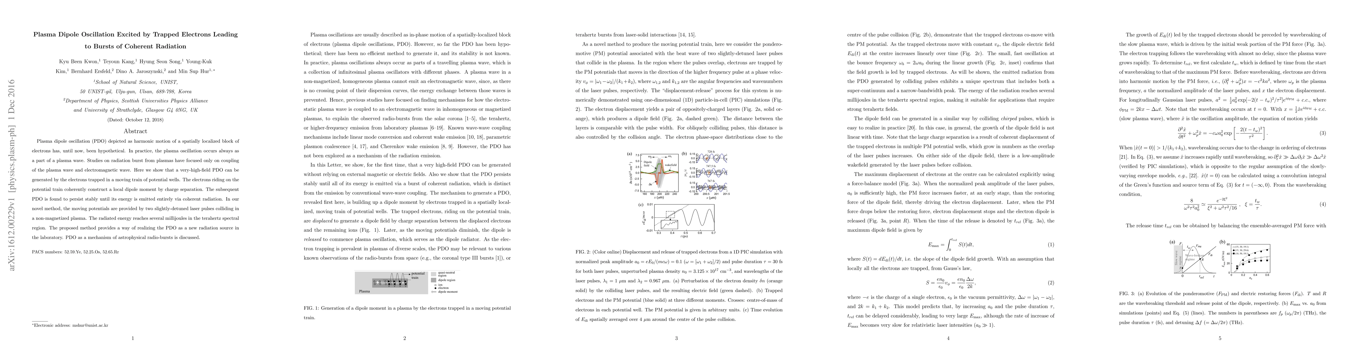 Plasma dipole oscillation (PDO) depicted as harmonic motion of a spatially localized block of electrons has, until now, been hypothetical. In practice, the plasma oscillation occurs always as a part of a plasma wave. Studies on radiation burst from plasmas have focused only on coupling of the plasma wave and electromagnetic wave. Here we show that a very-high-field PDO can be generated by the electrons trapped in a moving train of potential wells. The electrons riding on the potential train coherently construct a local dipole moment by charge separation. The subsequent PDO is found to persist stably until its energy is emitted entirely via coherent radiation. In our novel method, the moving potentials are provided by two slightly-detuned laser pulses colliding in a non-magnetized plasma. The radiated energy reaches several millijoules in the terahertz spectral region. The proposed method provides a way of realizing the PDO as a new radiation source in the laboratory. PDO as a mechanism of astrophysical radio-bursts is discussed.