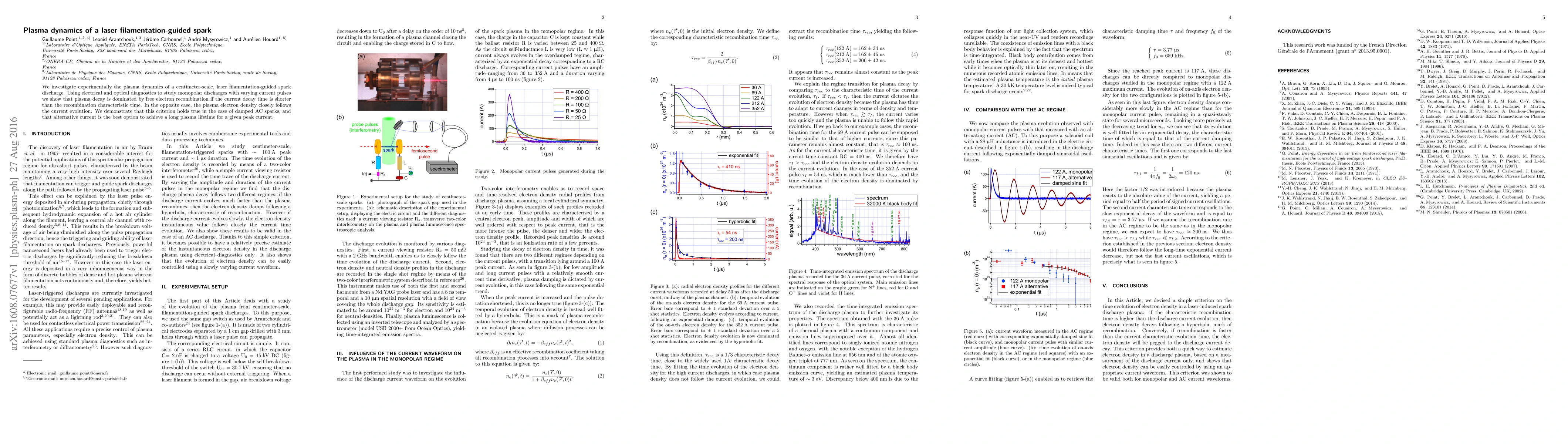 Researchers studied laser filamentation-guided spark discharges, finding that plasma decay is dominated by free electron recombination for short current pulses, while a long plasma lifetime requires alternative current.