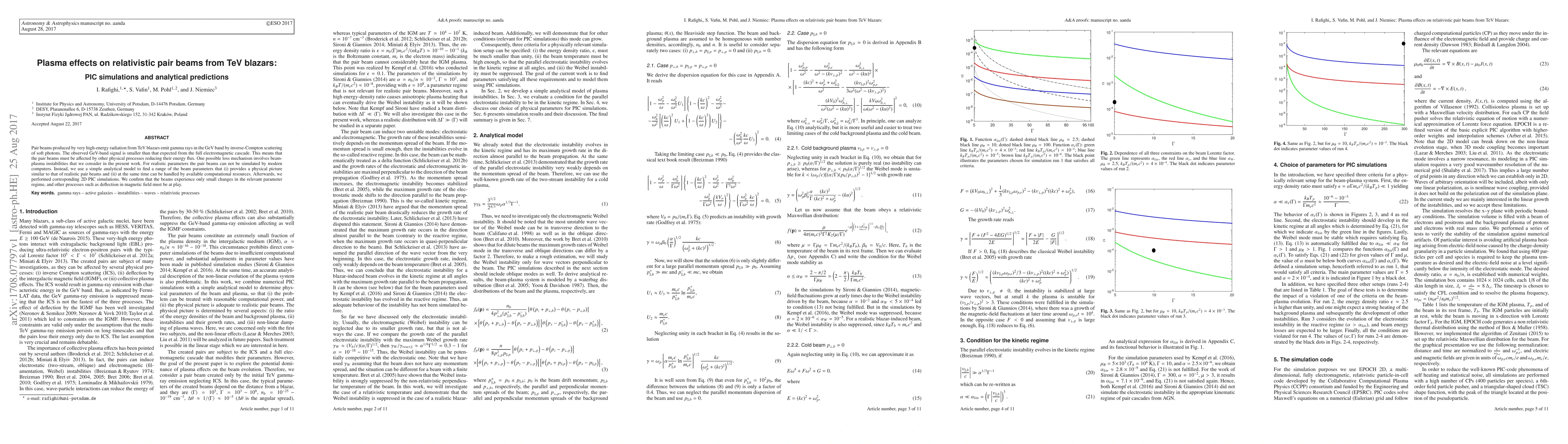 Researchers investigated how plasma affects relativistic pair beams from TeV blazars using an analytical model and 2D PIC simulations. They found that beam-plasma instabilities reduce the energy flux of these beams, supporting other loss mechanisms such as magnetic deflection.
