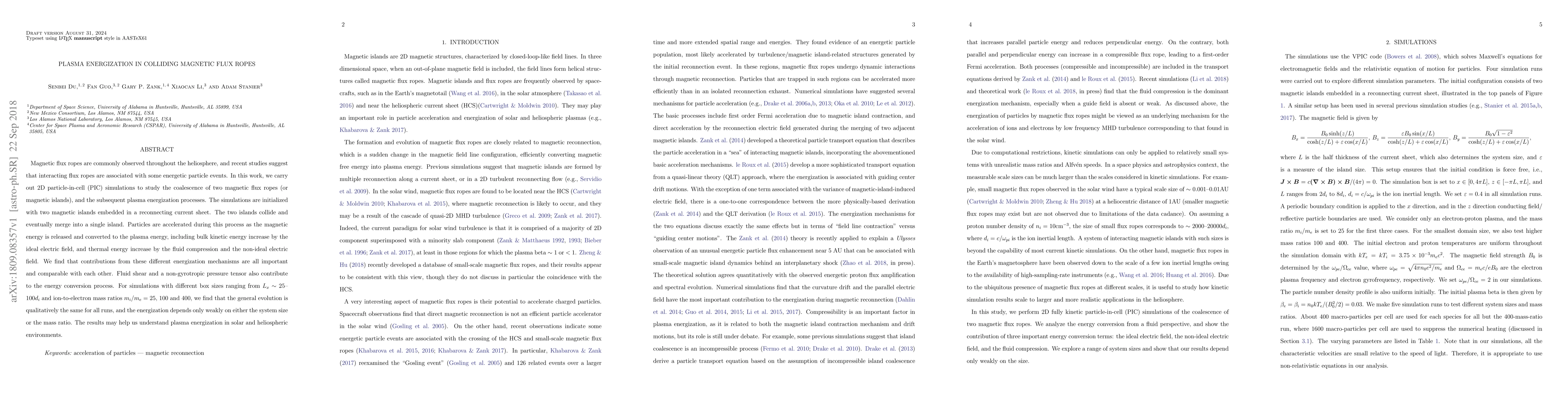 This study uses 2D particle-in-cell simulations to investigate the coalescence of two magnetic flux ropes, revealing that plasma energization occurs through multiple mechanisms including bulk kinetic and thermal energy increases. The results show consistent energization processes across different system sizes and mass ratios, suggesting a general understanding of plasma energization in solar and heliospheric environments.