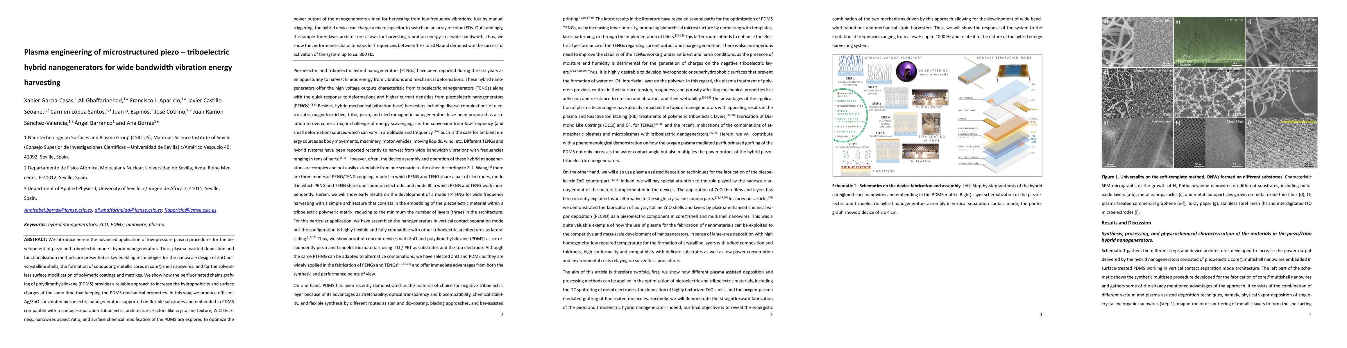 We introduce herein the advanced application of low pressure plasma procedures for the development of piezo and triboelectric mode I hybrid nanogenerators. Thus, plasma assisted deposition and functionalization methods are presented as key enabling technologies for the nanoscale design of ZnO polycrystalline shells, the formation of conducting metallic cores in core@shell nanowires, and for the solventless surface modification of polymeric coatings and matrixes. We show how the perfluorinated chains grafting of PDMS provides a reliable approach to increase the hydrophobicity and surface charges at the same time that keeping the PDMS mechanical properties. In this way, we produce efficient Ag/ZnO convoluted piezoelectric nanogenerators supported on flexible substrates and embedded in PDMS compatible with a contact separation triboelectric architecture. Factors like crystal-line texture, ZnO thickness, nanowires aspect ratio, and surface chemical modification of the PDMS are explored to optimize the power output of the nanogenerators aimed for harvesting from low-frequency vibrations. Just by manual trigger-ing, the hybrid device can charge a microcapacitor to switch on an array of color LEDs. Outstandingly, this simple three-layer architecture allows for harvesting vibration energy in a wide bandwidth, thus, we show the performance characteristics for frequencies between 1 Hz to 50 Hz and demonstrate the successful activation of the system up to ca. 800 Hz