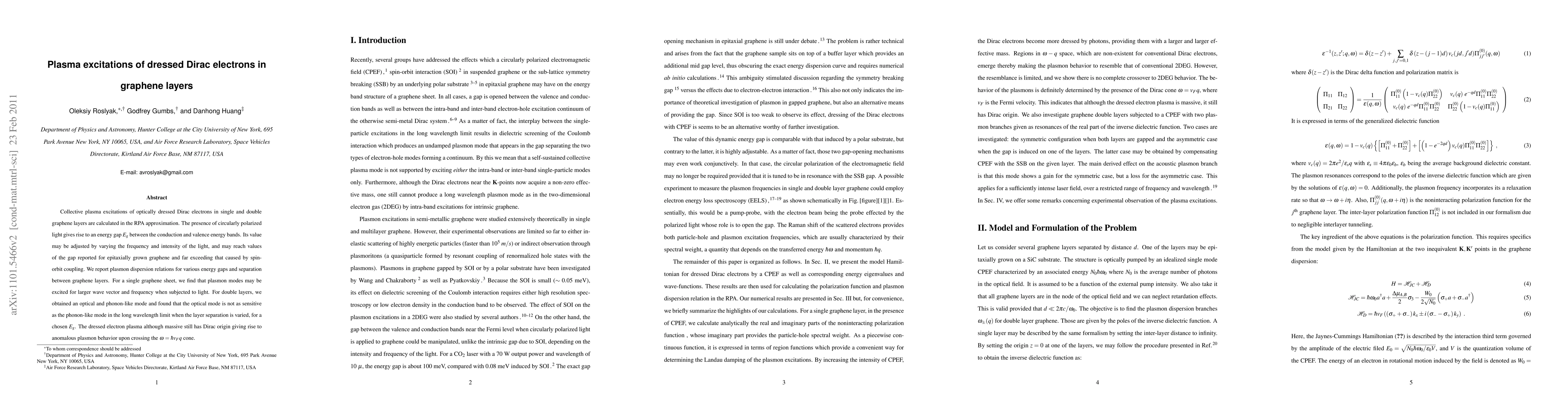 This paper investigates the plasma excitations of Dirac electrons in graphene layers influenced by circularly polarized light, revealing an energy gap that can be tuned by light frequency and intensity. The study finds distinct plasmon modes in single and double graphene layers, with the optical mode in double layers less sensitive to layer separation compared to the phonon-like mode.