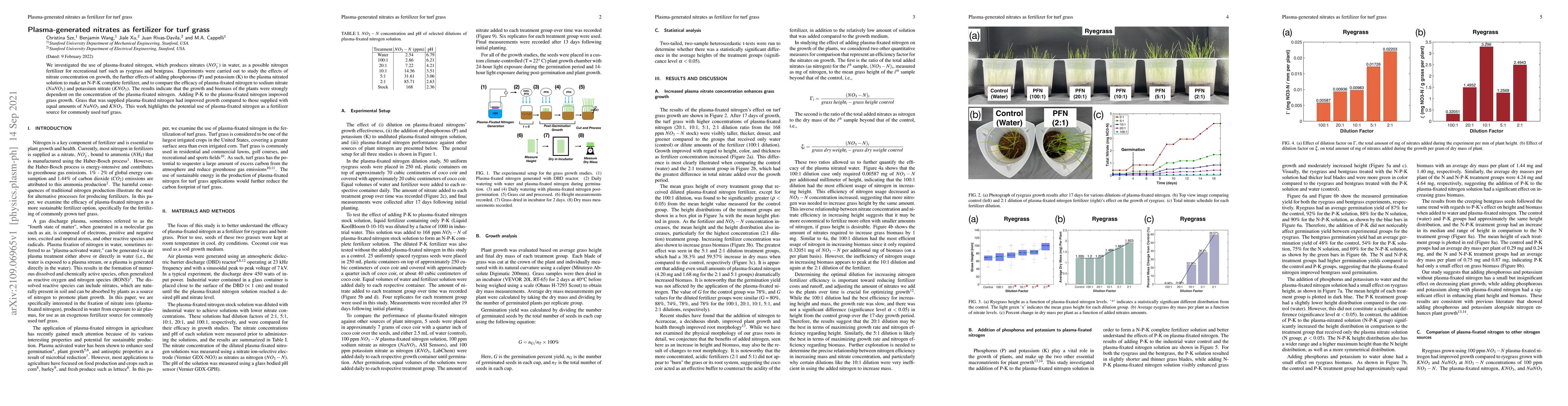 We investigated the use of plasma-fixated nitrogen, which produces nitrates (NO3-) in water, as a possible nitrogen fertilizer for recreational turf such as ryegrass and bentgrass. Experiments were carried out to study the effects of nitrate concentration on growth, the further effects of adding phosphorous (P) and potassium (K) to the plasma nitrated solution to make an N-P-K complete fertilizer, and to compare the efficacy of plasma-fixated nitrogen to sodium nitrate (NaNO3) and potassium nitrate (KNO3). The results indicate that the growth and biomass of the plants were strongly dependent on the concentration of the plasma-fixated nitrogen. Adding P-K to the plasma-fixated nitrogen improved grass growth. Grass that was supplied plasma-fixated nitrogen had improved growth compared to those supplied with equal amounts of NaNO3and KNO3. This work highlights the potential use of plasma-fixated nitrogen as a fertilizer source for commonly used turf grass.