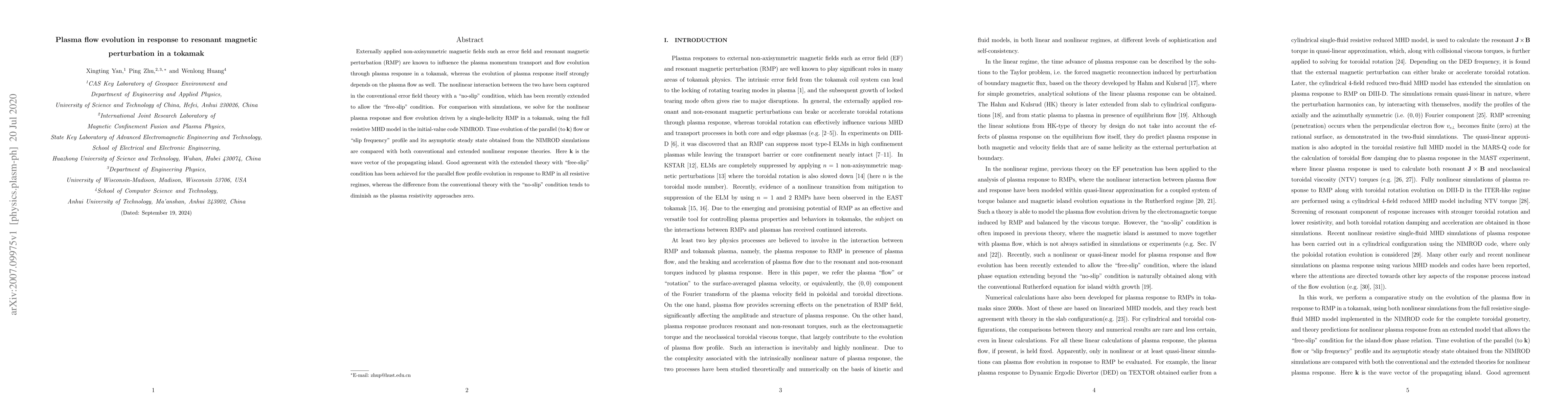 This paper investigates the evolution of plasma flow in response to resonant magnetic perturbations in a tokamak using full resistive MHD simulations. It finds that the extended nonlinear response theory with a "free-slip" condition better matches simulation results compared to the conventional "no-slip" theory, especially in resistive regimes.