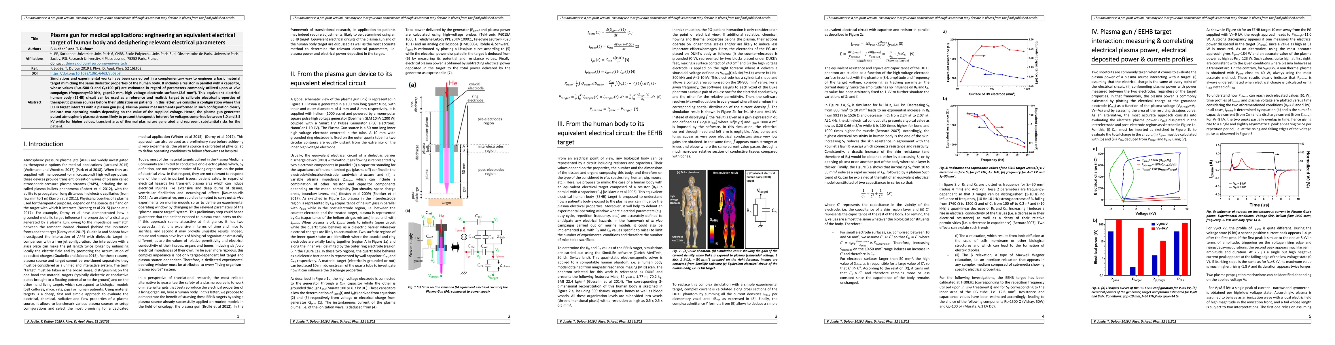 Simulations and experimental works have been carried out in a complementary way to engineer a basic material target mimicking the same dielectric properties of the human body. It includes a resistor in parallel with a capacitor, whose values (Rh=1500 {\Omega} and Ch=100 pF) are estimated in regard of parameters commonly utilized upon in vivo campaigns (frequency=30 kHz, gap=10 mm, high voltage electrode surface=12.6 mm2). This equivalent electrical human body (EEHB) circuit can be used as a reference and realistic target to calibrate electrical properties of therapeutic plasma sources before their utilization on patients. In this letter, we consider a configuration where this EEHB target interacts with a plasma gun (PG). Plasma power measurements performed in such configuration clearly indicate two operating modes depending on the value of the supplied voltage. Hence, the plasma gun generates pulsed atmospheric plasma streams likely to present therapeutic interest for voltages comprised between 3.0 and 8.5 kV while for higher values, transient arcs of thermal plasma are generated and represent substantial risks for the patient.