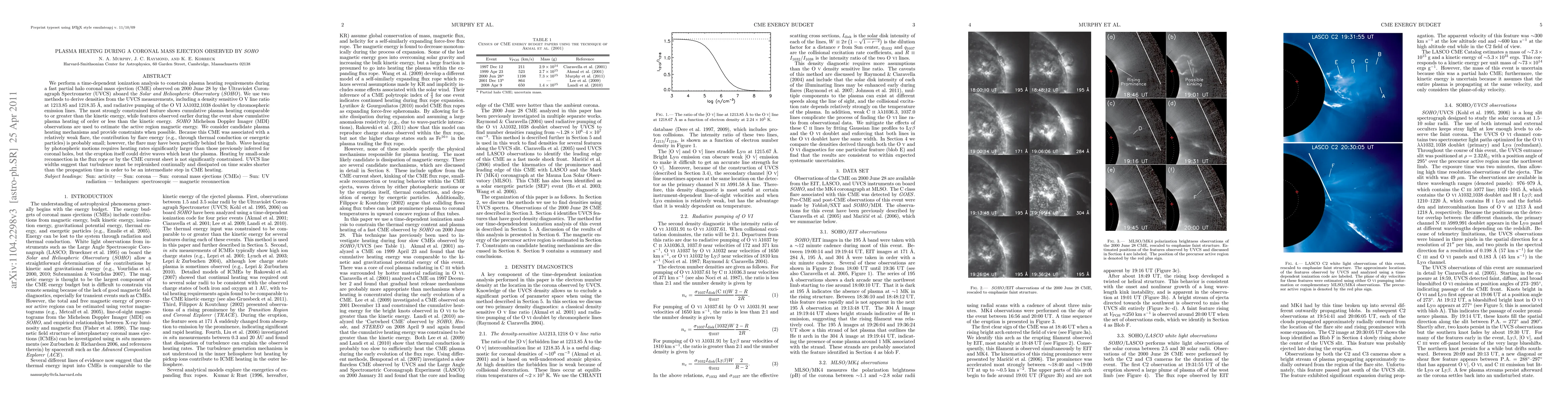 We perform a time-dependent ionization analysis to constrain plasma heating requirements during a fast partial halo coronal mass ejection (CME) observed on 2000 June 28 by the Ultraviolet Coronagraph Spectrometer (UVCS) aboard the Solar and Heliospheric Observatory (SOHO). We use two methods to derive densities from the UVCS measurements, including a density sensitive O V line ratio at 1213.85 and 1218.35 Angstroms, and radiative pumping of the O VI 1032,1038 doublet by chromospheric emission lines. The most strongly constrained feature shows cumulative plasma heating comparable to or greater than the kinetic energy, while features observed earlier during the event show cumulative plasma heating of order or less than the kinetic energy. SOHO Michelson Doppler Imager (MDI) observations are used to estimate the active region magnetic energy. We consider candidate plasma heating mechanisms and provide constraints when possible. Because this CME was associated with a relatively weak flare, the contribution by flare energy (e.g., through thermal conduction or energetic particles) is probably small; however, the flare may have been partially behind the limb. Wave heating by photospheric motions requires heating rates significantly larger than those previously inferred for coronal holes, but the eruption itself could drive waves which heat the plasma. Heating by small-scale reconnection in the flux rope or by the CME current sheet is not significantly constrained. UVCS line widths suggest that turbulence must be replenished continually and dissipated on time scales shorter than the propagation time in order to be an intermediate step in CME heating.