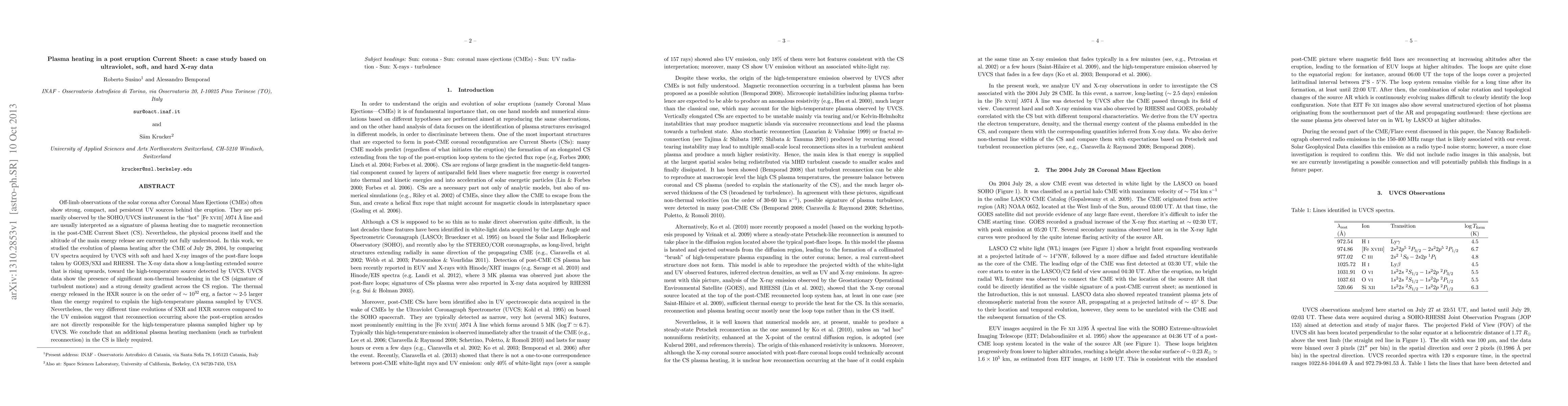 This study investigates plasma heating in the post-eruption current sheet following a 2004 CME, using UVCS, GOES/SXI, and RHESSI data. The analysis reveals a long-lasting extended X-ray source rising towards the high-temperature UV source, suggesting an additional heating mechanism beyond simple reconnection.