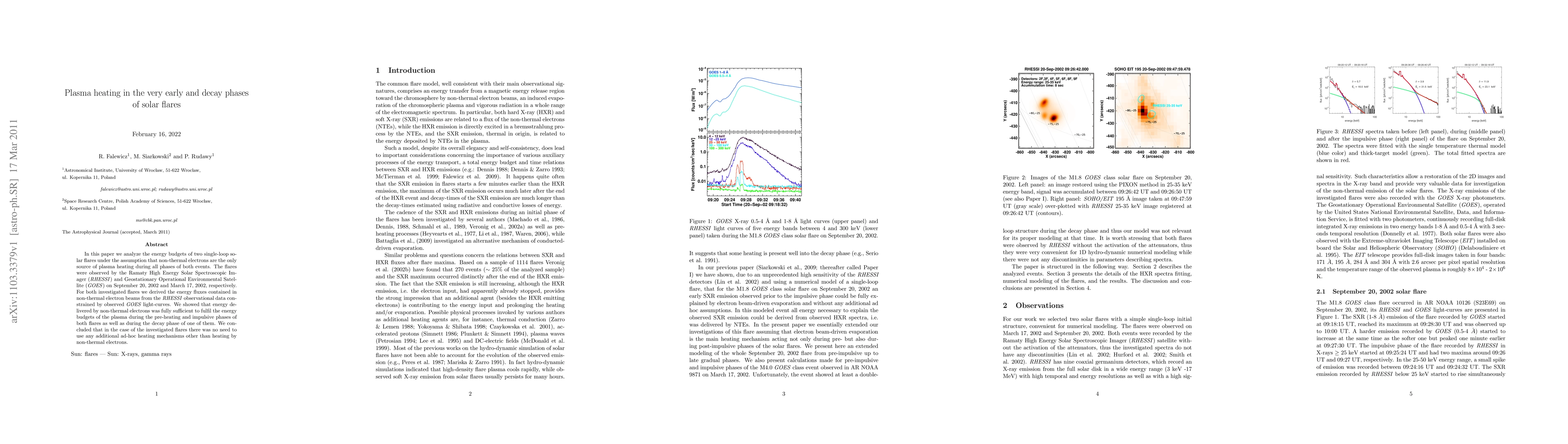 In this paper we analyze the energy budgets of two single-loop solar flares under the assumption that non-thermal electrons are the only source of plasma heating during all phases of both events. The flares were observed by the Ramaty High Energy Solar Spectroscopic Imager (RHESSI) and Geostationary Operational Environmental Satellite (GOES) on September 20, 2002 and March 17, 2002, respectively. For both investigated flares we derived the energy fluxes contained in non-thermal electron beams from the RHESSI observational data constrained by observed GOES light-curves. We showed that energy delivered by non-thermal electrons was fully sufficient to fulfil the energy budgets of the plasma during the pre-heating and impulsive phases of both flares as well as during the decay phase of one of them. We concluded that in the case of the investigated flares there was no need to use any additional ad-hoc heating mechanisms other than heating by non-thermal electrons.