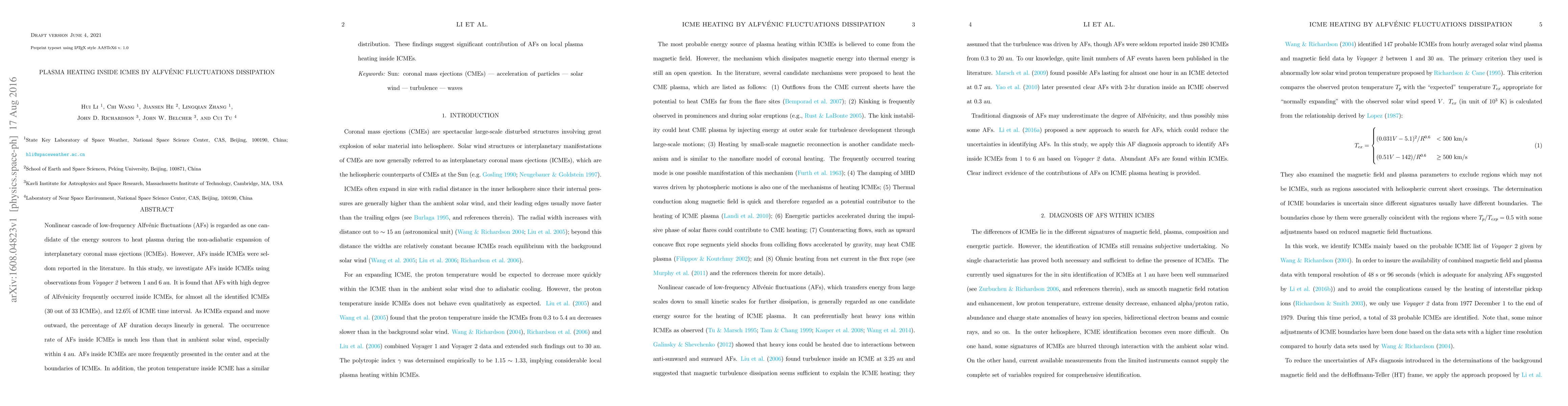 Nonlinear cascade of low-frequency Alfvenic fluctuations (AFs) is regarded as one candidate of the energy sources to heat plasma during the non-adiabatic expansion of interplanetary coronal mass ejections (ICMEs). However, AFs inside ICMEs were seldom reported in the literature. In this study, we investigate AFs inside ICMEs using observations from Voyager 2 between 1 and 6 au. It is found that AFs with high degree of Alfvenicity frequently occurred inside ICMEs, for almost all the identified ICMEs (30 out of 33 ICMEs), and 12.6% of ICME time interval. As ICMEs expand and move outward, the percentage of AF duration decays linearly in general. The occurrence rate of AFs inside ICMEs is much less than that in ambient solar wind, especially within 4 au. AFs inside ICMEs are more frequently presented in the center and at the boundaries of ICMEs. In addition, the proton temperature inside ICME has a similar distribution. These findings suggest significant contribution of AFs on local plasma heating inside ICMEs.