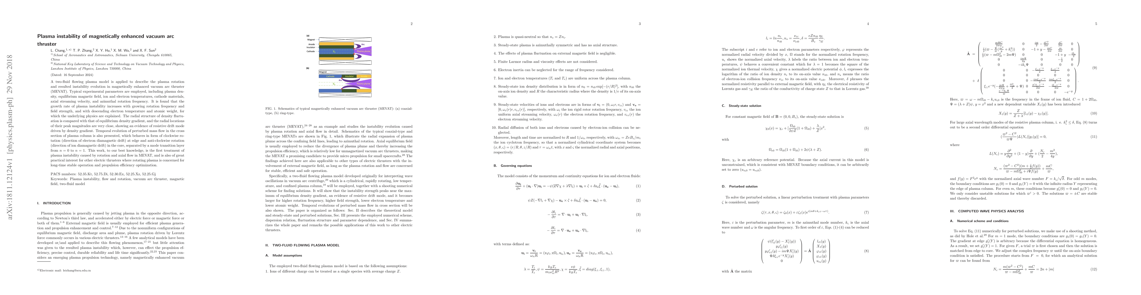 This paper investigates the plasma instability in magnetically enhanced vacuum arc thrusters using a two-fluid model, finding that instability growth correlates with higher rotation frequency, magnetic field strength, and lower electron temperature. The study reveals a resistive drift mode driven by density gradient and provides insights into the temporal evolution of perturbed mass flow in the plasma column.