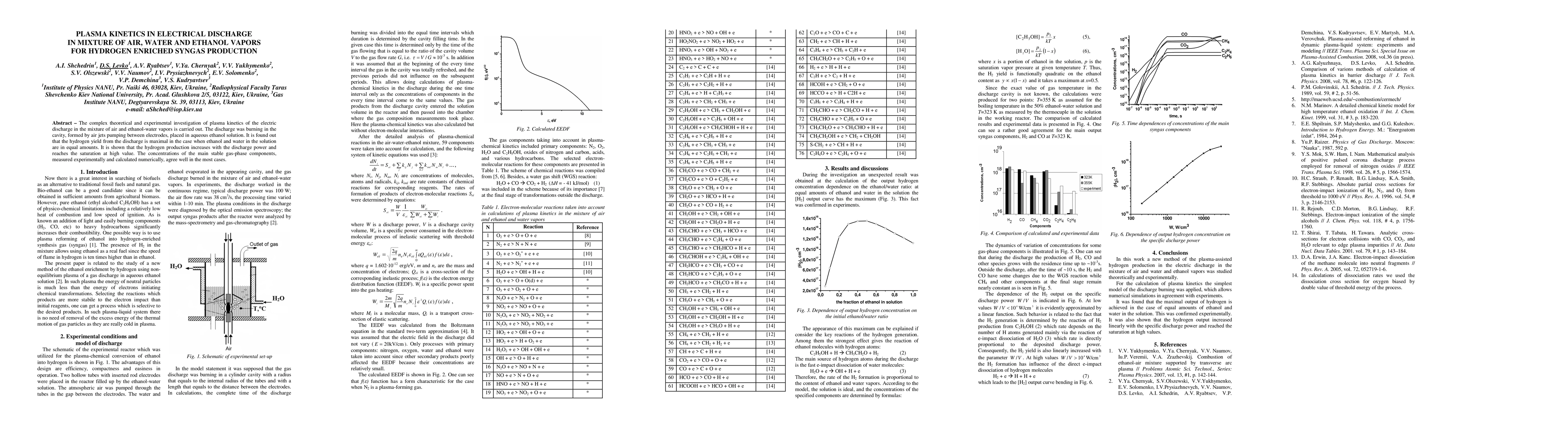 This study investigates the plasma kinetics of electrical discharge in a mixture of air, ethanol, and water vapors for hydrogen-enriched syngas production. The optimal hydrogen yield occurs when ethanol and water are in equal amounts, with production increasing with discharge power until saturation.