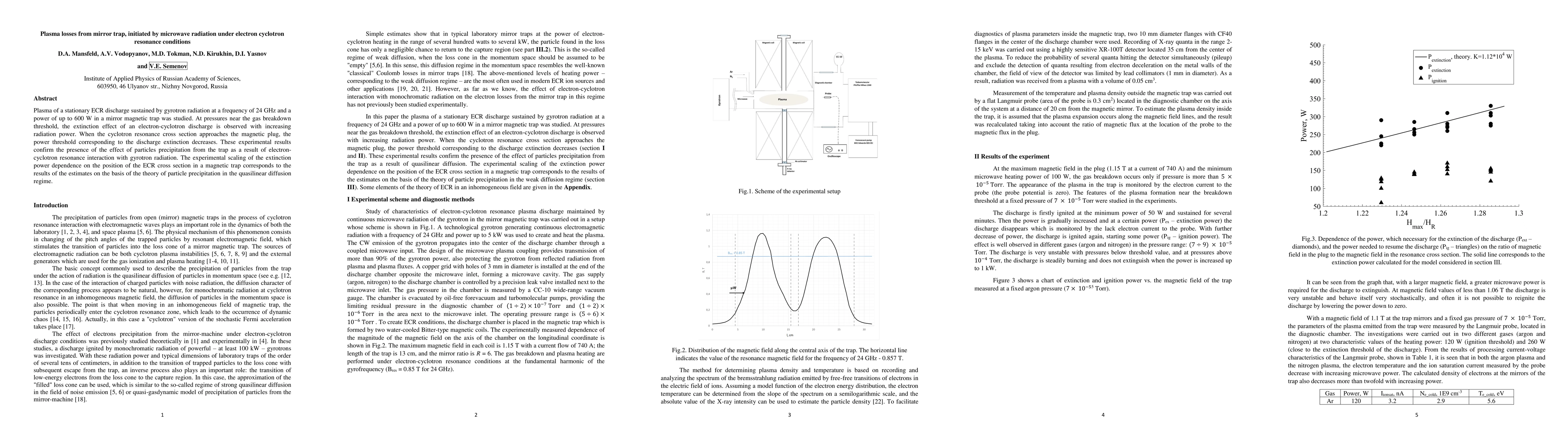 This paper investigates plasma losses in a mirror trap under electron cyclotron resonance (ECR) conditions induced by gyrotron radiation. Experimental results show that increasing radiation power leads to discharge extinction, confirming particle precipitation due to resonance interactions, with the observed power threshold aligning with theoretical predictions.