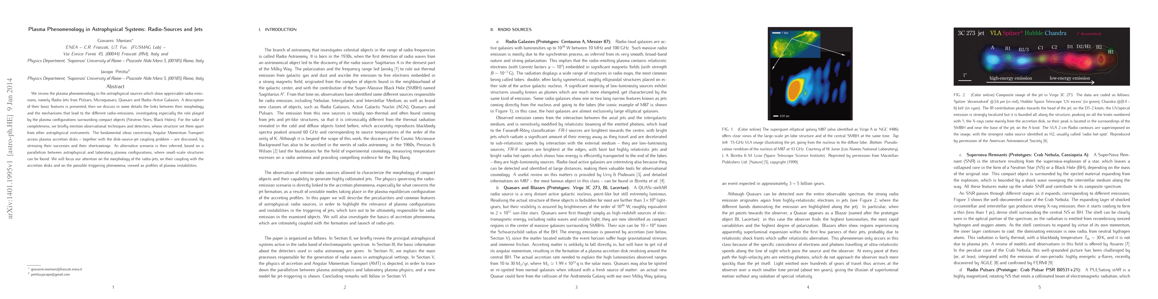 We review the plasma phenomenology in the astrophysical sources which show appreciable radio emissions, namely Radio-Jets from Pulsars, Microquasars, Quasars and Radio-Active Galaxies. A description of their basic features is presented, then we discuss in some details the links between their morphology and the mechanisms that lead to the different radio-emissions, investigating especially the role played by the plasma configurations surrounding compact objects (Neutron Stars, Black Holes). For the sake of completeness, we briefly mention observational techniques and detectors, whose structure set them apart from other astrophysical instruments. The fundamental ideas concerning Angular Momentum Transport across plasma accretion disks (together with the disk-source-jet coupling problem) are discussed, by stressing their successes and their shortcomings. An alternative scenario is then inferred, based on a parallelism between astrophysical and laboratory plasma configurations, where small-scale structures can be found. We will focus our attention on the morphology of the radio-jets, on their coupling with the accretion disks and on the possible triggering phenomena, viewed as profiles of plasma instabilities.