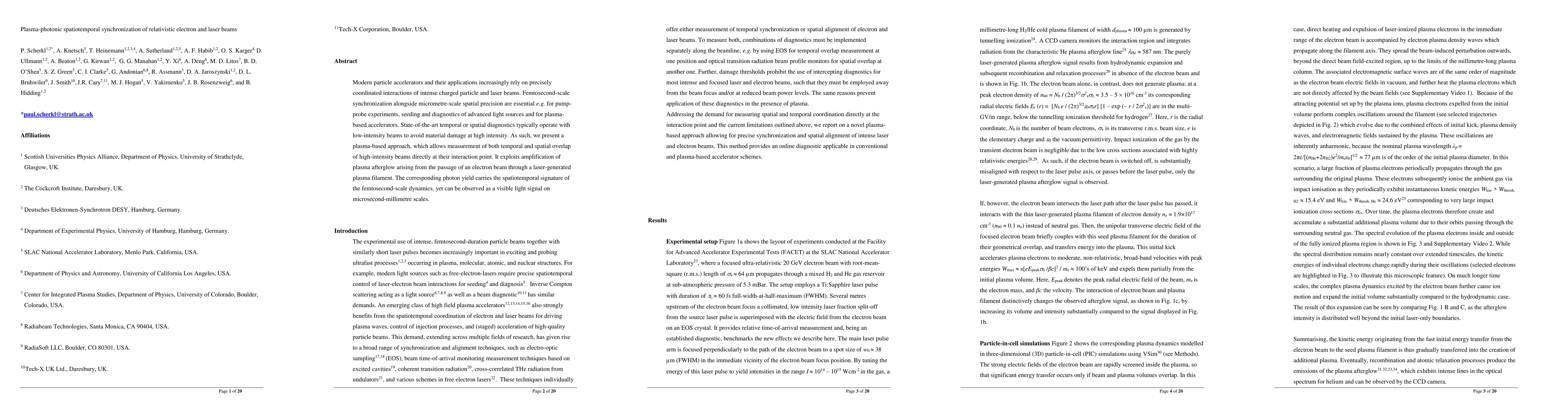 This paper presents a plasma-based method for achieving femtosecond-scale synchronization and micrometre-scale spatial precision in high-intensity electron and laser beams. It uses the amplification of plasma afterglow to measure the spatiotemporal overlap directly at the interaction point, facilitating advanced applications like pump-probe experiments and plasma-based accelerators.