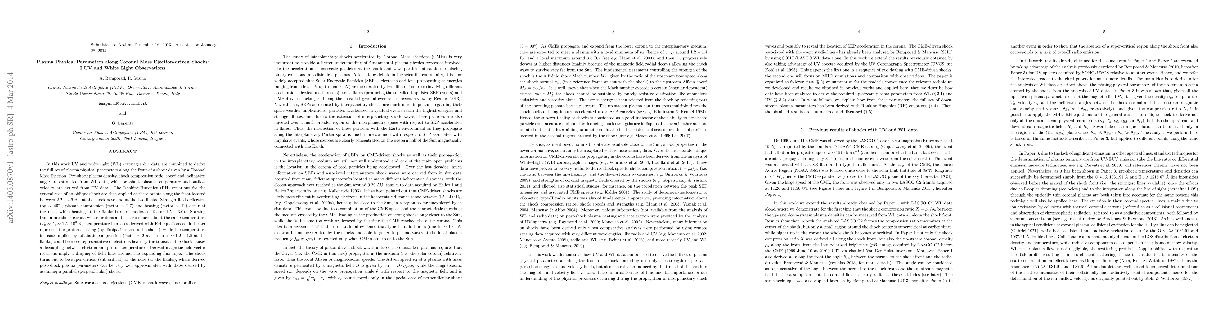 This paper combines UV and white light coronagraphic data to determine plasma physical parameters along a Coronal Mass Ejection-driven shock, revealing stronger field deflection, plasma compression, and heating at the nose compared to the flanks. The study finds a decoupling between electron and proton temperatures post-shock.