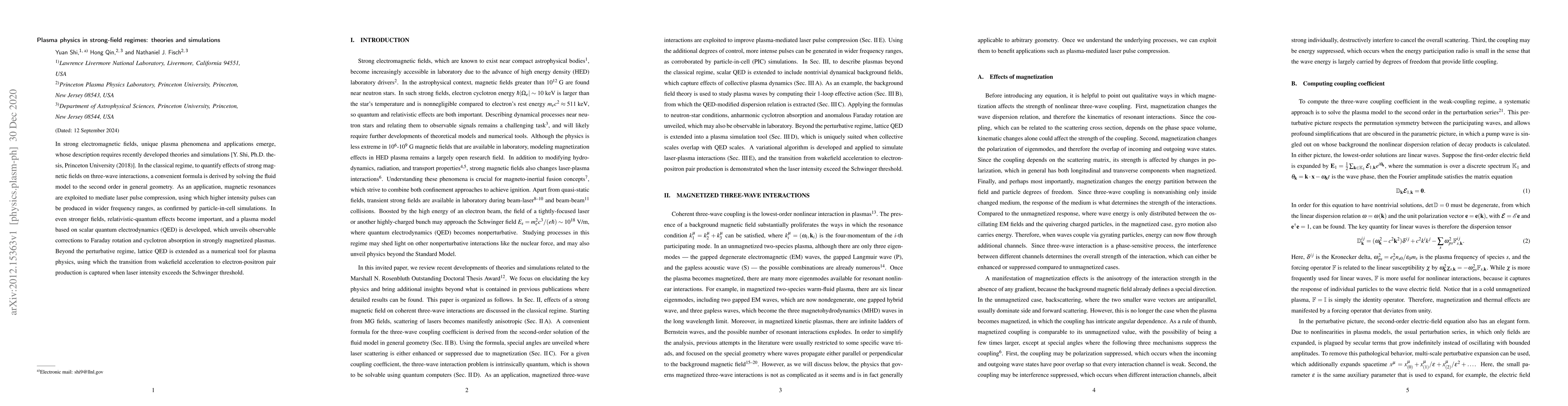 This paper explores plasma physics in strong electromagnetic fields, developing theories and simulations for classical and relativistic regimes. It derives a formula for magnetic field effects on three-wave interactions and uses magnetic resonances for laser pulse compression, validated by simulations. It also extends lattice QED to model relativistic-quantum effects, revealing corrections in Faraday rotation and cyclotron absorption.