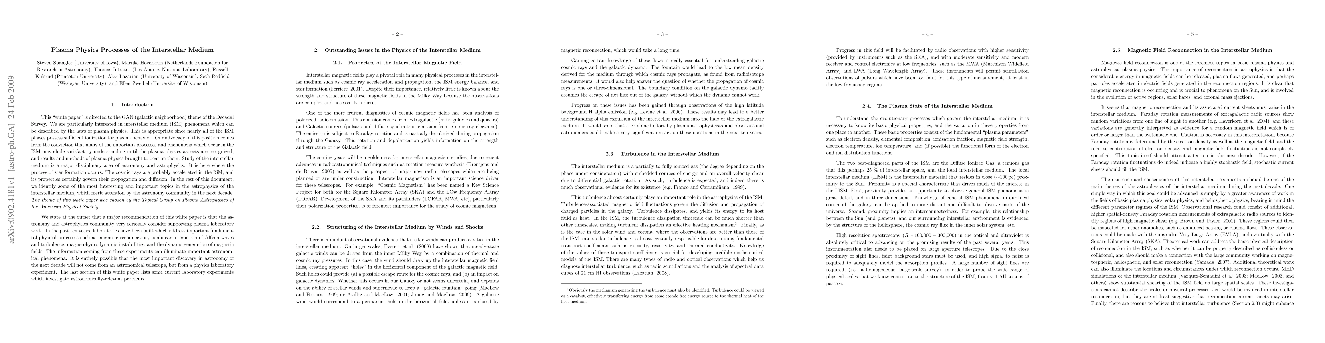 We discuss the outstanding issues of the interstellar medium which will depend on the application of knowledge from plasma physics. We particularly advocate attention to recent developments in experimental plasma physics, and urge that the astronomical community consider support of these experiments in the next decade.