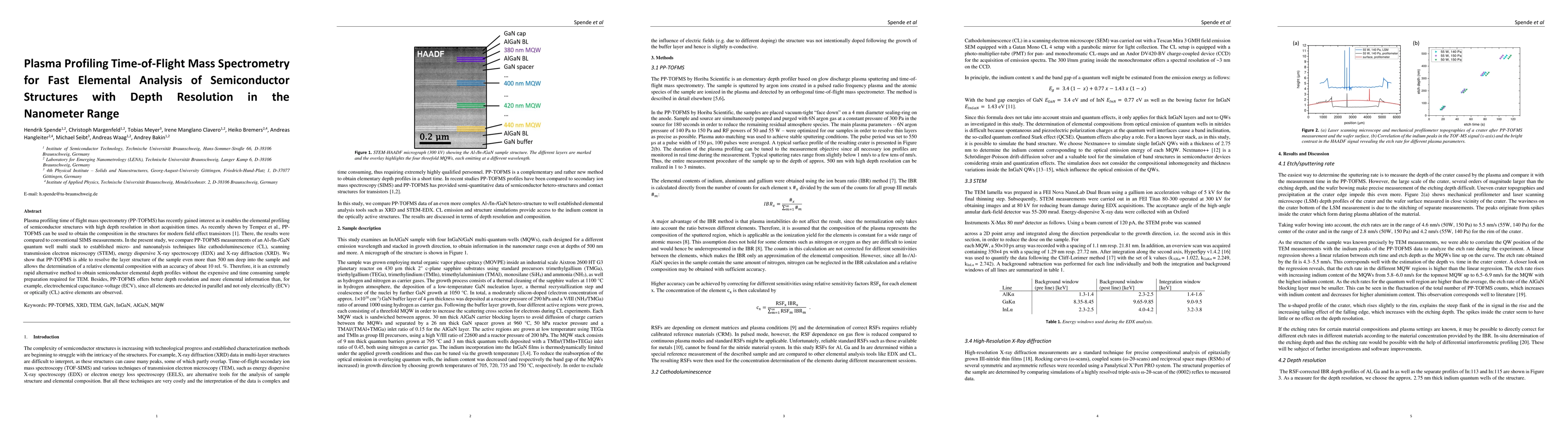 Plasma profiling time-of-flight mass spectrometry (PP-TOFMS) provides rapid elemental profiling of semiconductor structures with nanometer depth resolution, offering an alternative to conventional SIMS and TEM methods. This study demonstrates PP-TOFMS's ability to resolve multi-layered Al-/In-/GaN quantum wells with high accuracy and depth, surpassing other techniques in depth resolution and elemental information.