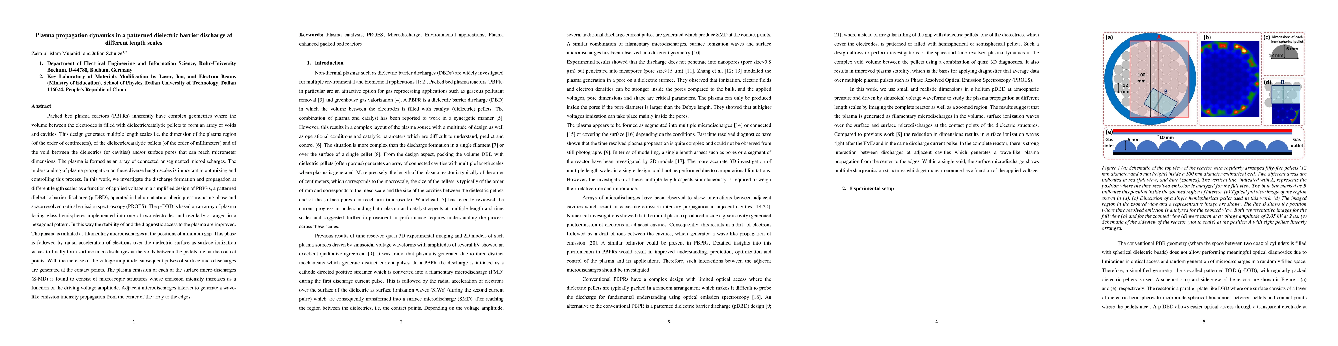 This study investigates the dynamics of plasma propagation in a patterned dielectric barrier discharge (p-DBD) across various length scales, employing phase and space resolved optical emission spectroscopy. The p-DBD features an array of glass hemispheres on one electrode, leading to filamentary microdischarges and surface ionization waves that propagate as surface microdischarges at voids between pellets, with intensity increasing with applied voltage.