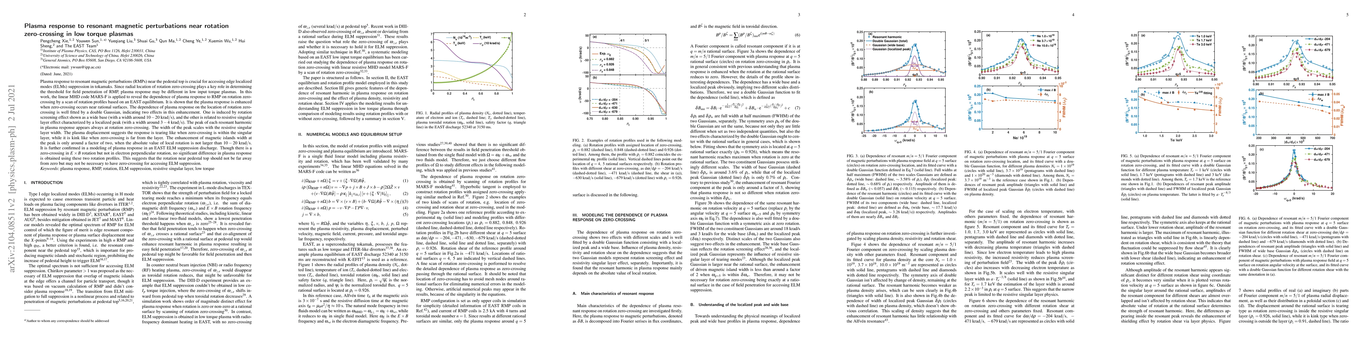 Plasma response to resonant magnetic perturbations (RMPs) near the pedestal top is crucial for accessing edge localized modes (ELMs) suppression in tokamaks. Since radial location of rotation zero-crossing plays a key role in determining the threshold for field penetration of RMP, plasma response may be different in low input torque plasmas. In this work, the linear MHD code MARS-F is applied to reveal the dependence of plasma response to RMP on rotation zero-crossing by a scan of rotation profiles based on an EAST equilibrium. It is shown that the plasma response is enhanced when zero-crossing occurs near rational surfaces. The dependence of plasma response on the location of rotation zero-crossing is well fitted by a double Gaussian, indicating two effects in this enhancement. One is induced by rotation screening effect shown as a wide base (with a width around 10-20 krad/s), and the other is related to resistive singular layer effect characterized by a localized peak (with a width around 3-4 krad/s). The width of the peak scales with the resistive singular layer width. The plasma displacement suggests the response is tearing like when zero-crossing is within the singular layer, while it is kink like when zero-crossing is far from the layer. The enhancement of magnetic islands width at the peak is only around a factor of two, when the absolute value of local rotation is not larger than 10-20 krad/s. It is further confirmed in a modeling of plasma response in an EAST ELM suppression discharge. Though there is a zero-crossing in $E\times B$ rotation but not in electron perpendicular rotation, no significant difference in plasma response is obtained using these two rotation profiles. This suggests that the rotation near pedestal top should not be far away from zero but may not be necessary to have zero-crossing for accessing ELM suppression.