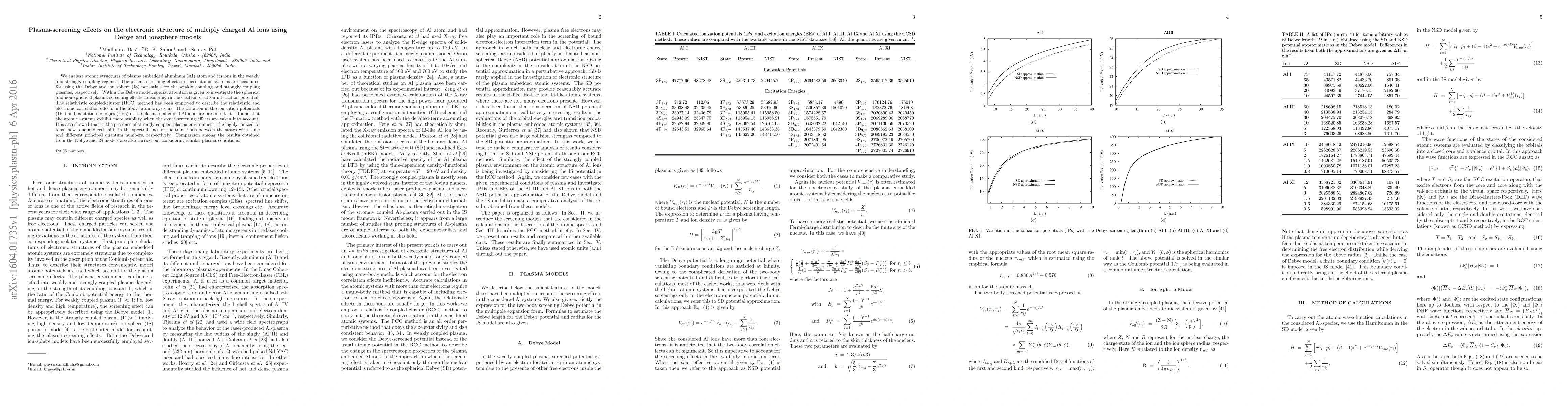 This paper investigates the electronic structure of plasma-embedded aluminum ions using Debye and ion sphere models to account for plasma screening effects. The study reveals enhanced stability and shifts in spectral lines of highly ionized Al ions under strongly coupled plasma conditions, with the Debye model highlighting both spherical and non-spherical screening effects.