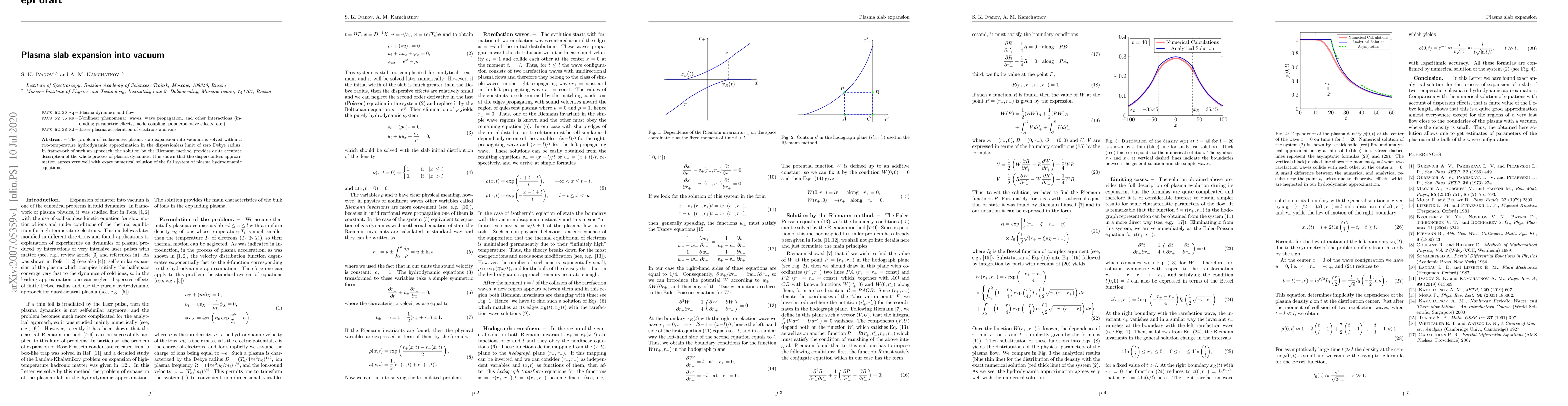 This paper investigates the expansion of a collisionless plasma slab into vacuum using a two-temperature hydrodynamic approximation with zero Debye radius. The Riemann method provides an accurate description of the plasma dynamics, and results align closely with numerical solutions of the full plasma hydrodynamic equations.