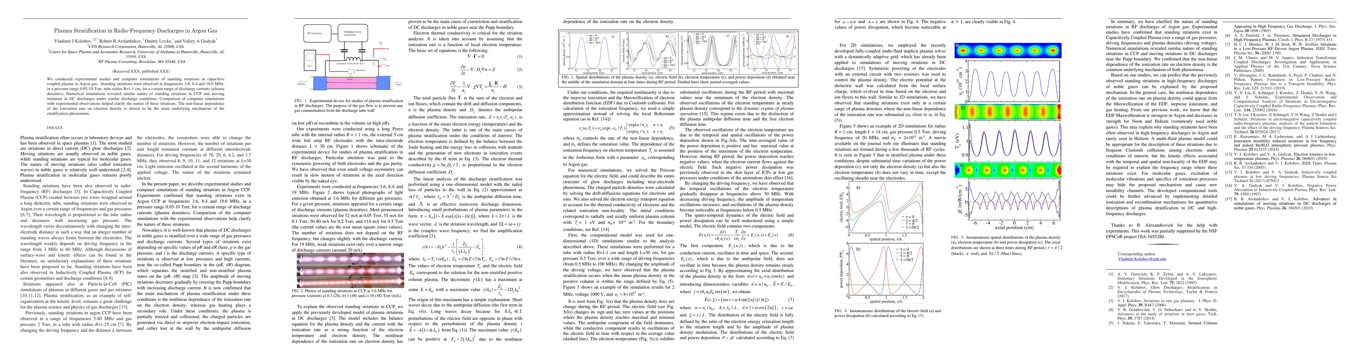 This paper investigates standing striations in capacitively coupled plasma discharges in Argon gas, observed experimentally and simulated computationally. The study reveals that the non-linear ionization rate dependency on electron density is the primary driver of plasma stratification, with similar phenomena seen in both radio-frequency and DC discharges.