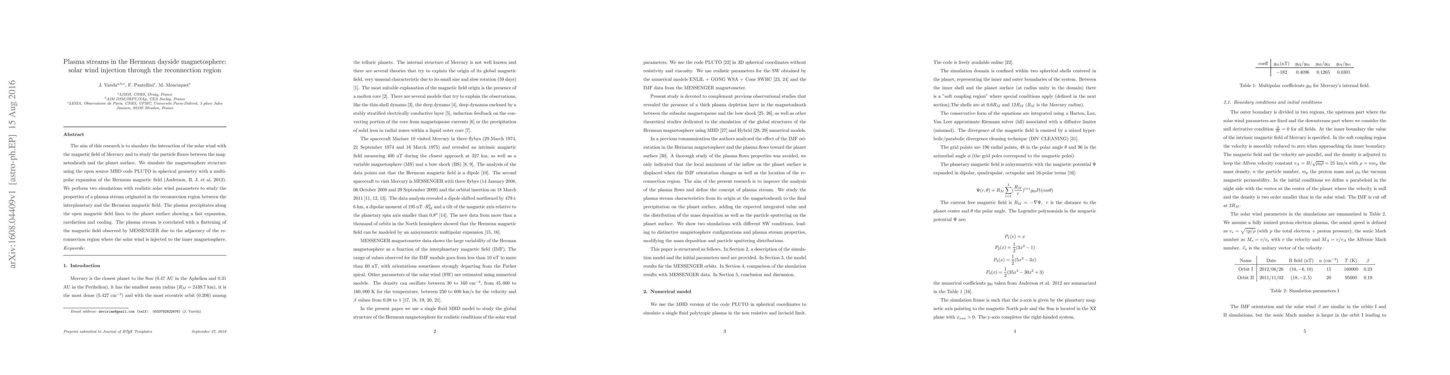 The aim of this research is to simulate the interaction of the solar wind with the magnetic field of Mercury and to study the particle fluxes between the magnetosheath and the planet surface. We simulate the magnetosphere structure using the open source MHD code PLUTO in spherical geometry with a multipolar expansion of the Hermean magnetic field (Anderson, B. J. et al, 2012). We perform two simulations with realistic solar wind parameters to study the properties of a plasma stream originated in the reconnection region between the interplanetary and the Hermean magnetic field. The plasma precipitates along the open magnetic field lines to the planet surface showing a fast expansion, rarefaction and cooling. The plasma stream is correlated with a flattening of the magnetic field observed by MESSENGER due to the adjacency of the reconnection region where the solar wind is injected to the inner magnetosphere.