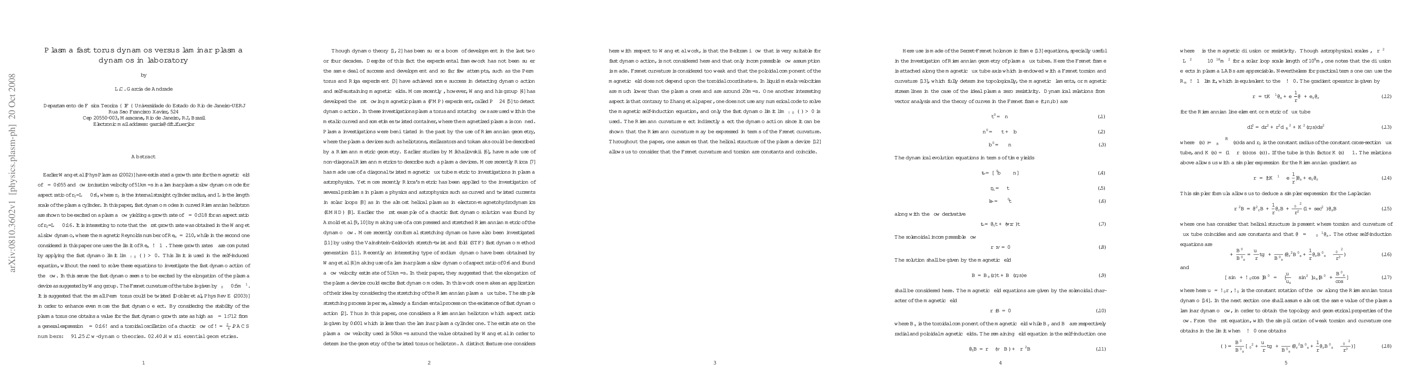 This paper compares magnetic field growth rates in plasma torus dynamos versus laminar plasma dynamos, showing that the fast dynamo mode in a curved Riemannian heliotron yields a significantly higher growth rate of ${\gamma}=0.318$ compared to the laminar dynamo's ${\gamma}=0.055$, suggesting enhanced dynamo action through elongation and curvature.