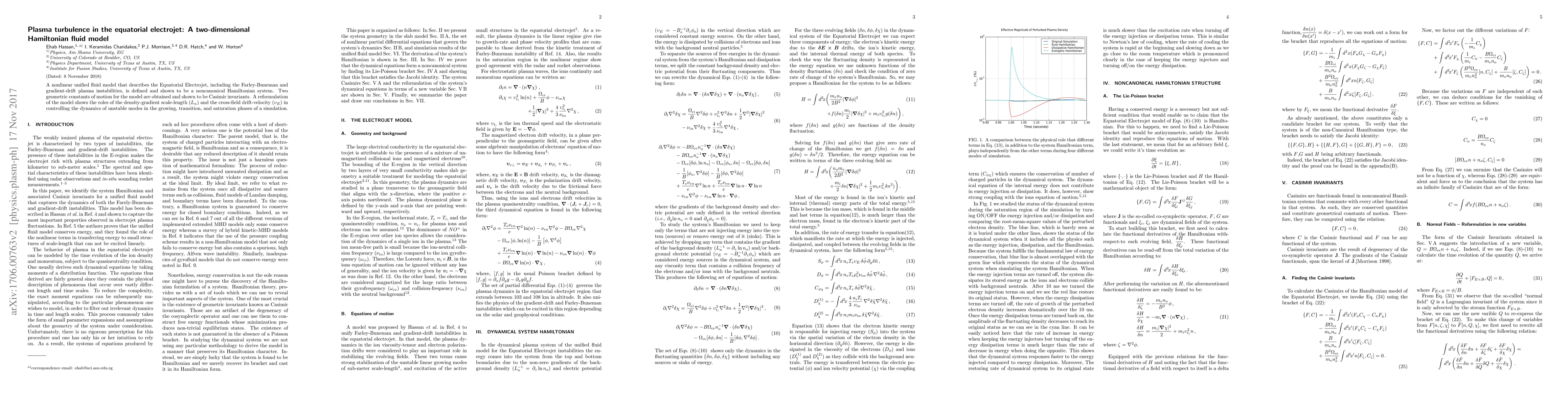 A nonlinear unified fluid model that describes the Equatorial Electrojet, including the Farley-Buneman and gradient-drift plasma instabilities, is defined and shown to be a noncanonical Hamiltonian system. Two geometric constants of motion for the model are obtained and shown to be Casimir invariants. A reformulation of the model shows the roles of the density-gradient scale-length ($L_n$) and the cross-field drift-velocity (${\upsilon}_E$) in controlling the dynamics of unstable modes in the growing, transition, and saturation phases of a simulation.
