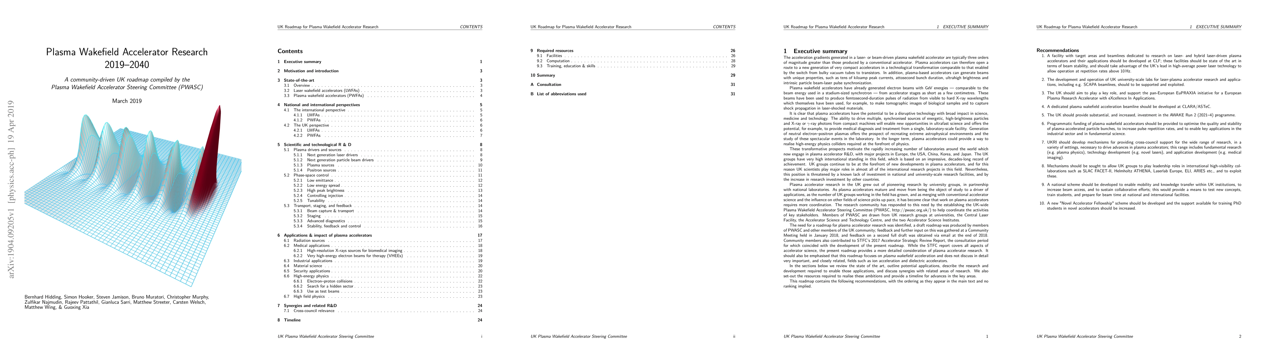 The acceleration gradients generated in a laser- or beam-driven plasma wakefield accelerator are typically three orders of magnitude greater than those produced by a conventional accelerator, and hence plasma accelerators can open a route to a new generation of very compact machines. In addition, plasma-based accelerators can generate beams with unique properties, such as tens of kiloamp peak currents, attosecond bunch duration, ultrahigh brightness and intrinsic particle beam-laser pulse synchronization. In this roadmap we review the status of plasma accelerator research in the UK. We outline potential applications, describe the research and development required to enable those applications, and discuss synergies with related areas of research. We also set-out the resources required to realise these ambitions and provide a timeline for advances in the key areas.