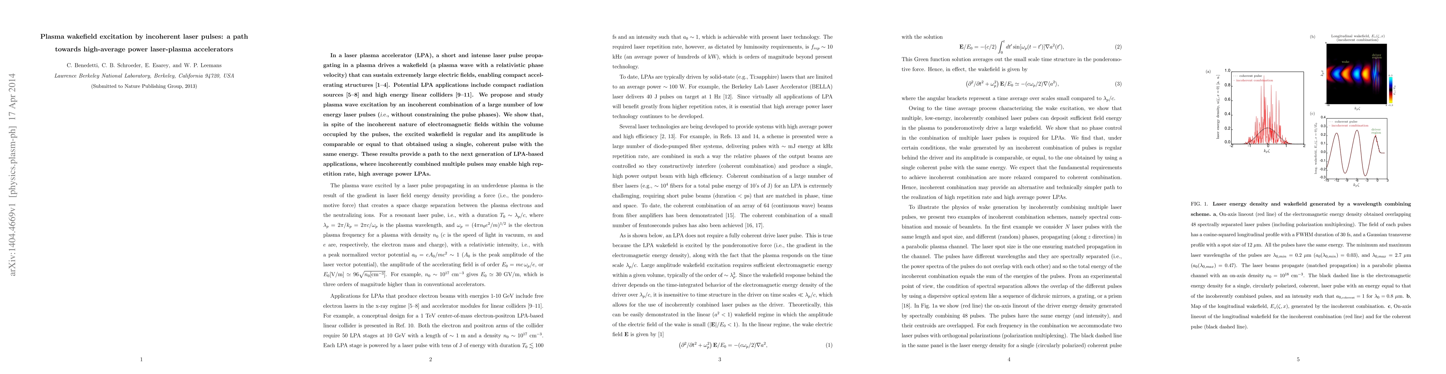 This paper proposes using an incoherent combination of multiple low-energy laser pulses to excite plasma wakefields in laser plasma accelerators, achieving regular wakefields with comparable amplitudes to those from a single coherent pulse. This approach paves the way for high-average power, high repetition rate laser-plasma accelerators.