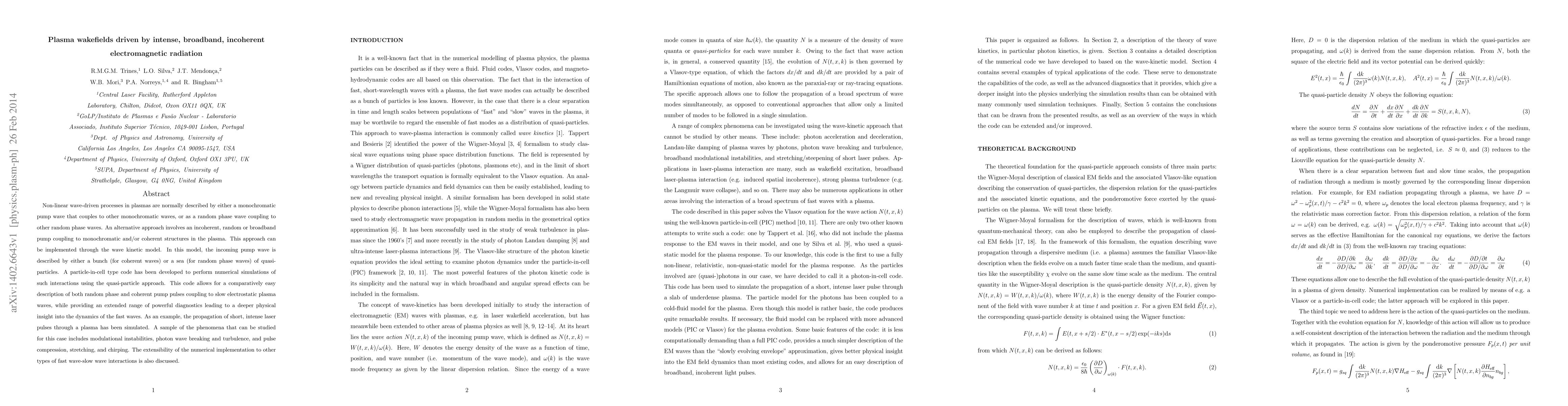 Non-linear wave-driven processes in plasmas are normally described by either a monochromatic pump wave that couples to other monochromatic waves, or as a random phase wave coupling to other random phase waves. An alternative approach involves an incoherent, random or broadband pump coupling to monochromatic and/or coherent structures in the plasma. This approach can be implemented through the wave kinetic model. In this model, the incoming pump wave is described by either a bunch (for coherent waves) or a sea (for random phase waves) of quasi-particles. A particle-in-cell type code has been developed to perform numerical simulations of such interactions using the quasi-particle approach. This code allows for a comparatively easy description of both random phase and coherent pump pulses coupling to slow electrostatic plasma waves, while providing an extended range of powerful diagnostics leading to a deeper physical insight into the dynamics of the fast waves. As an example, the propagation of short, intense laser pulses through a plasma has been simulated. A sample of the phenomena that can be studied for this case includes modulational instabilities, photon wave breaking and turbulence, and pulse compression, stretching, and chirping. The extensibility of the numerical implementation to other types of fast wave-slow wave interactions is also discussed.