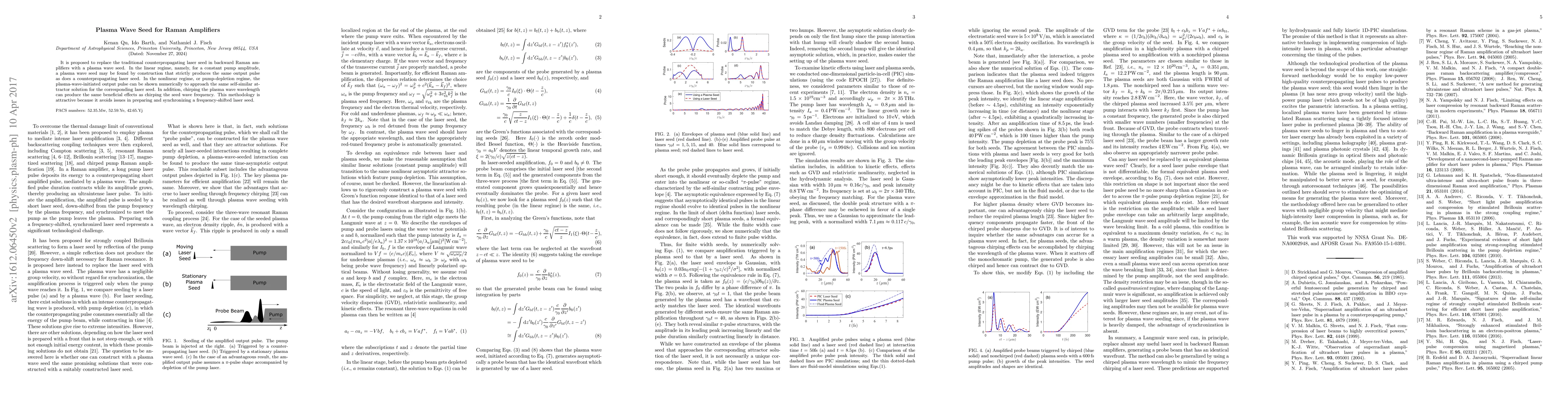 This paper proposes using a plasma wave seed instead of a traditional counterpropagating laser seed in backward Raman amplifiers. It demonstrates that a plasma wave seed can produce the same output pulse as a laser seed, both in linear and nonlinear regimes, and offers the same benefits as chirping the seed wave frequency.