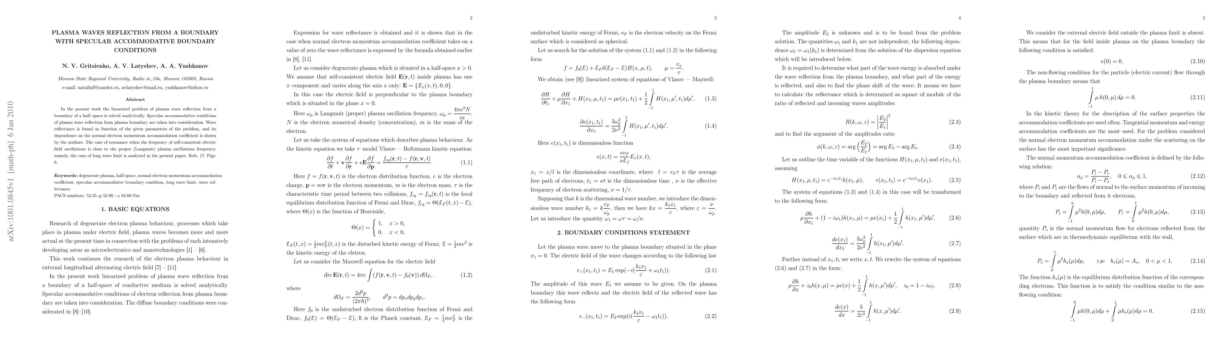 In the present work the linearized problem of plasma wave reflection from a boundary of a half--space is solved analytically. Specular accommodative conditions of plasma wave reflection from plasma boundary are taken into consideration. Wave reflectance is found as function of the given parameters of the problem, and its dependence on the normal electron momentum accommodation coefficient is shown by the authors. The case of resonance when the frequency of self-consistent electric field oscillations is close to the proper (Langmuir) plasma oscillations frequency, namely, the case of long wave limit is analyzed. Refs. 17. Figs. 6.