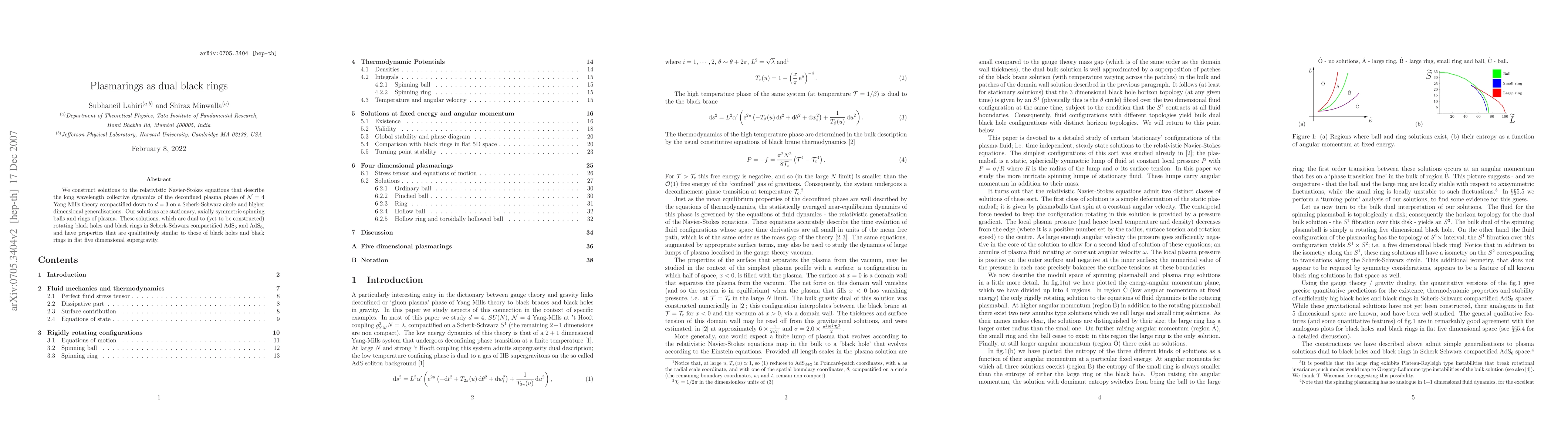This research constructs solutions to the relativistic Navier-Stokes equations, modeling long wavelength plasma dynamics in N=4 Yang Mills theory compactified to three dimensions. These stationary, axially symmetric plasma 'rings' are dual to hypothetical rotating black holes and black rings in higher-dimensional AdS spaces, sharing properties with black holes and rings in five-dimensional supergravity.