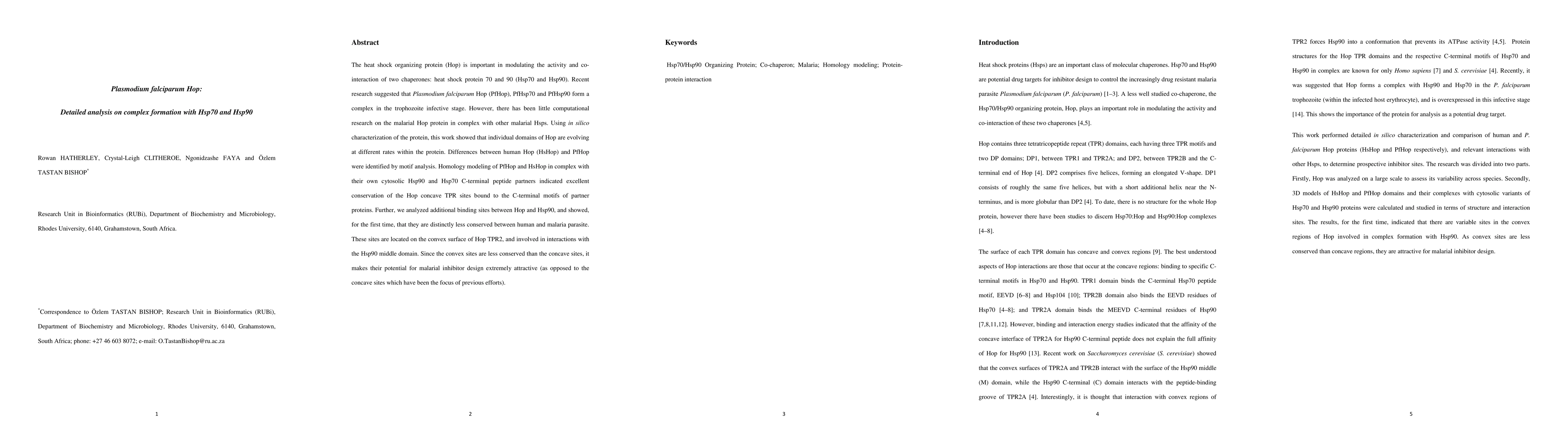 The heat shock organizing protein (Hop) is important in modulating the activity and co-interaction of two chaperones: heat shock protein 70 and 90 (Hsp70 and Hsp90). Recent research suggested that Plasmodium falciparum Hop (PfHop), PfHsp70 and PfHsp90 form a complex in the trophozoite infective stage. However, there has been little computational research on the malarial Hop protein in complex with other malarial Hsps. Using in silico characterization of the protein, this work showed that individual domains of Hop are evolving at different rates within the protein. Differences between human Hop (HsHop) and PfHop were identified by motif analysis. Homology modeling of PfHop and HsHop in complex with their own cytosolic Hsp90 and Hsp70 C-terminal peptide partners indicated excellent conservation of the Hop concave TPR sites bound to the C-terminal motifs of partner proteins. Further, we analyzed additional binding sites between Hop and Hsp90, and showed, for the first time, that they are distinctly less conserved between human and malaria parasite. These sites are located on the convex surface of Hop TPR2, and involved in interactions with the Hsp90 middle domain. Since the convex sites are less conserved than the concave sites, it makes their potential for malarial inhibitor design extremely attractive (as opposed to the concave sites which have been the focus of previous efforts).